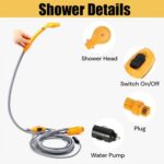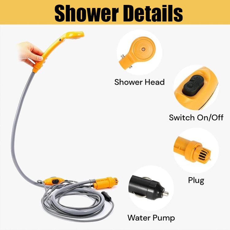 The system is designed for ease of use and portability. Simply immerse the pump in a water source—a bucket, stream, or any other suitable container—connect the hose and shower head, and plug the power adapter into your vehicle’s 12V outlet.
