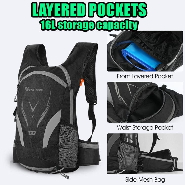 Conquer any trail or commute with the West Biking 16L Hydration Backpack, a versatile and comfortable companion for all your outdoor adventures. This lightweight (Only 355grams and durable backpack features a spacious 16L capacity, ample compartments for organizing your gear, and a convenient 2L hydration bladder to keep you hydrated on the go.