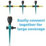 Each sprinkler boasts a robust construction, designed to withstand the rigors of outdoor use, and is easily anchored into the ground with its sturdy spike.