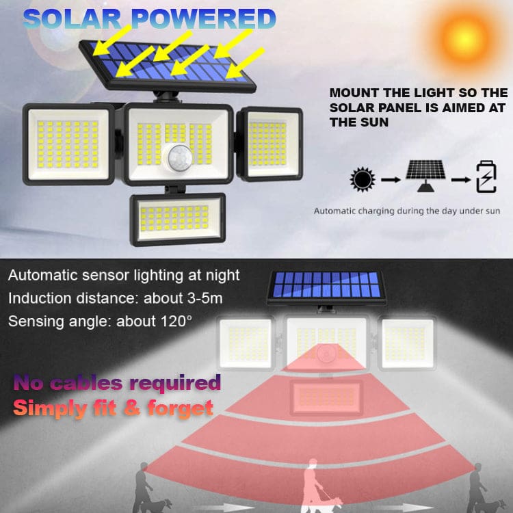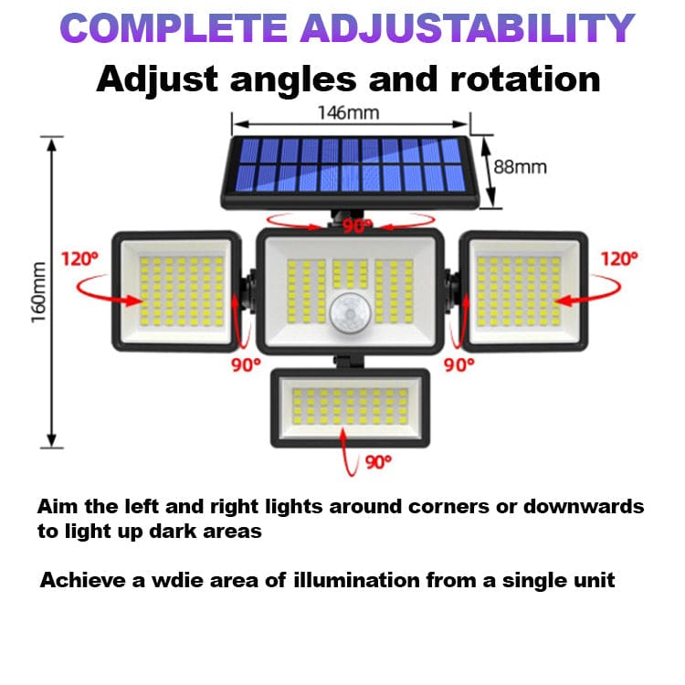 Operating the light is easy with an on/off and mode selection switch. Simply select the mode you prefer and mount the light so the solar panel is aimed towards the sunlight. The light comes with 208 high brightness LED bulbs and fully adjustable angles/rotation on the side and bottom light panels.