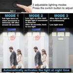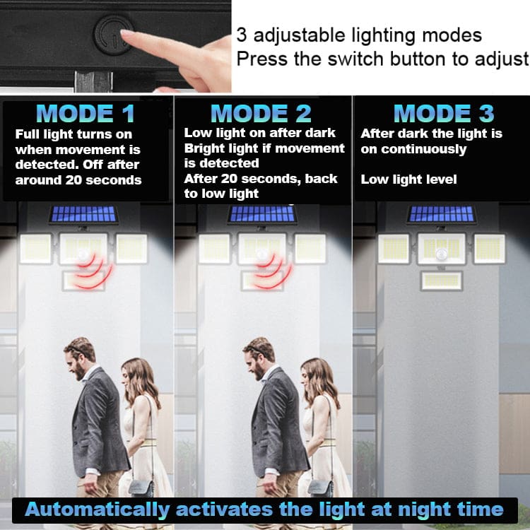 With three different modes of night lighting, this light automatically activates at night-time and recharges during the day from the sun. In mode 1, the light is at high brightness when movement is detected, then returns to OFF after 20 seconds. In mode 2, it is at low brightness after dark and goes to high brightness when movement is detected, then back to low light after 20 seconds. In mode 3, the light remains on after dark but at a low light level.