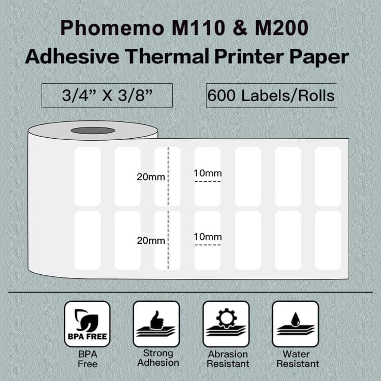 Includes 1 x roll of 600 20x10mm rectangular thermal labels – White