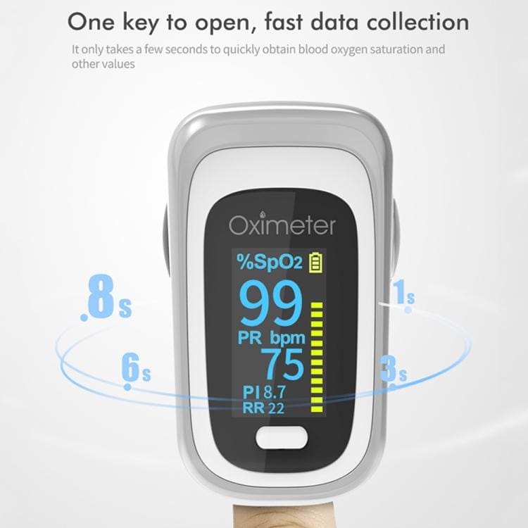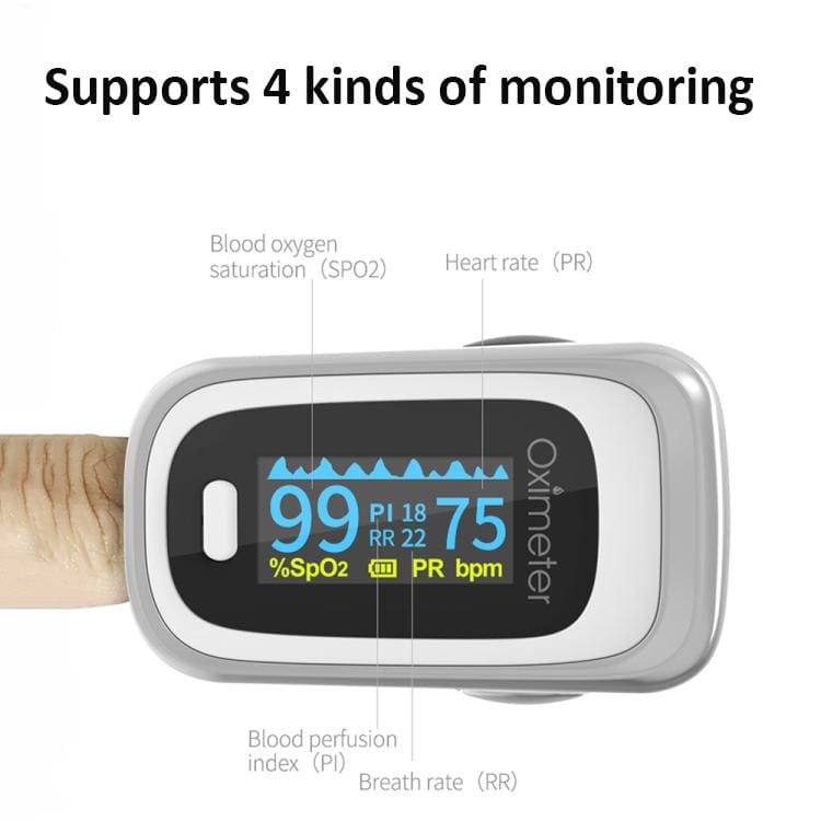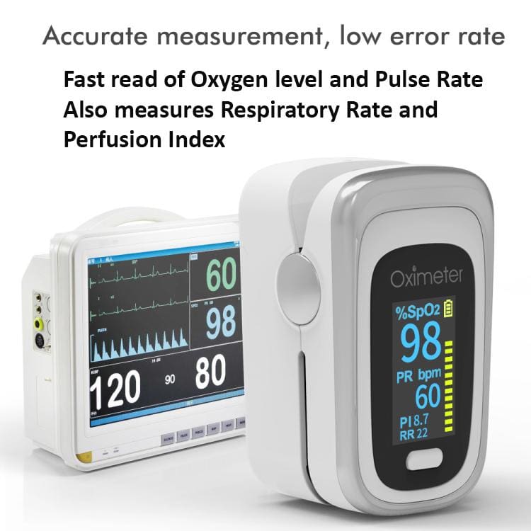 The 130R Finger Pulse Oximeter measures SpO2 (Oxygen levels), PR (Pulse Rate), PI (Perfusion Index) and RR (Respiratory Rate) with a high degree of accuracy
