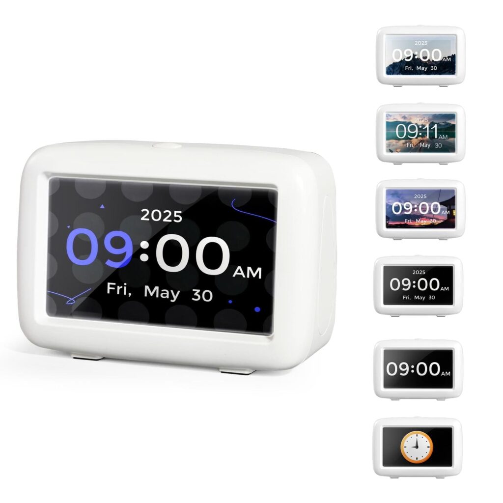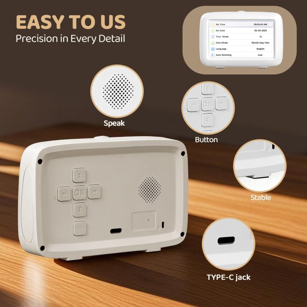 This clock goes beyond telling time—it helps manage daily routines with up to five standard alarms and three medication reminders. Multiple themes and time formats (month-day-year or day-month-year) allow customization to personal preference. With support for eight languages and both 12H/24H formats, it’s adaptable for different users and settings.