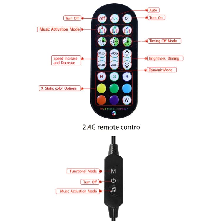 - Set lights to music, over 200+ colour patterns or mic/music/sound activated (mic built-in)