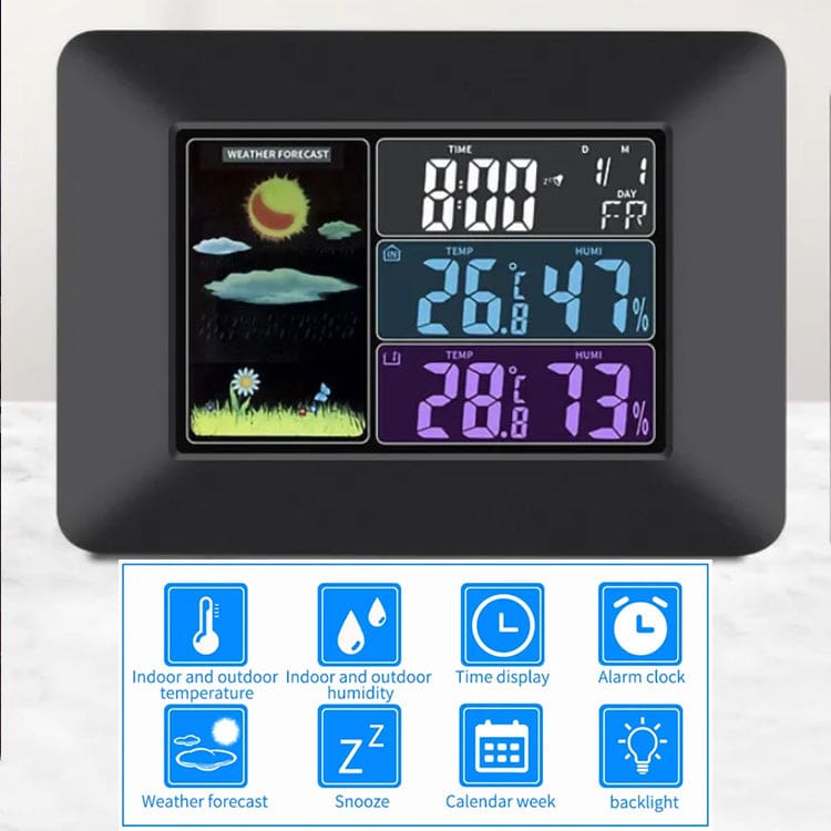 The A97 weather station is a stylish and functional addition to any home. It features a large, easy-to-read LCD display that shows the current time, date, indoor and outdoor temperature and humidity, and a weather forecast. The station also has an alarm clock and a sleep function.