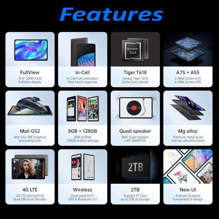 Tiger T618 Octa-Core processor, a huge 8GB of RAM and 128GB of storage memory and 10.4″ screen with a 1200×2000 resolution