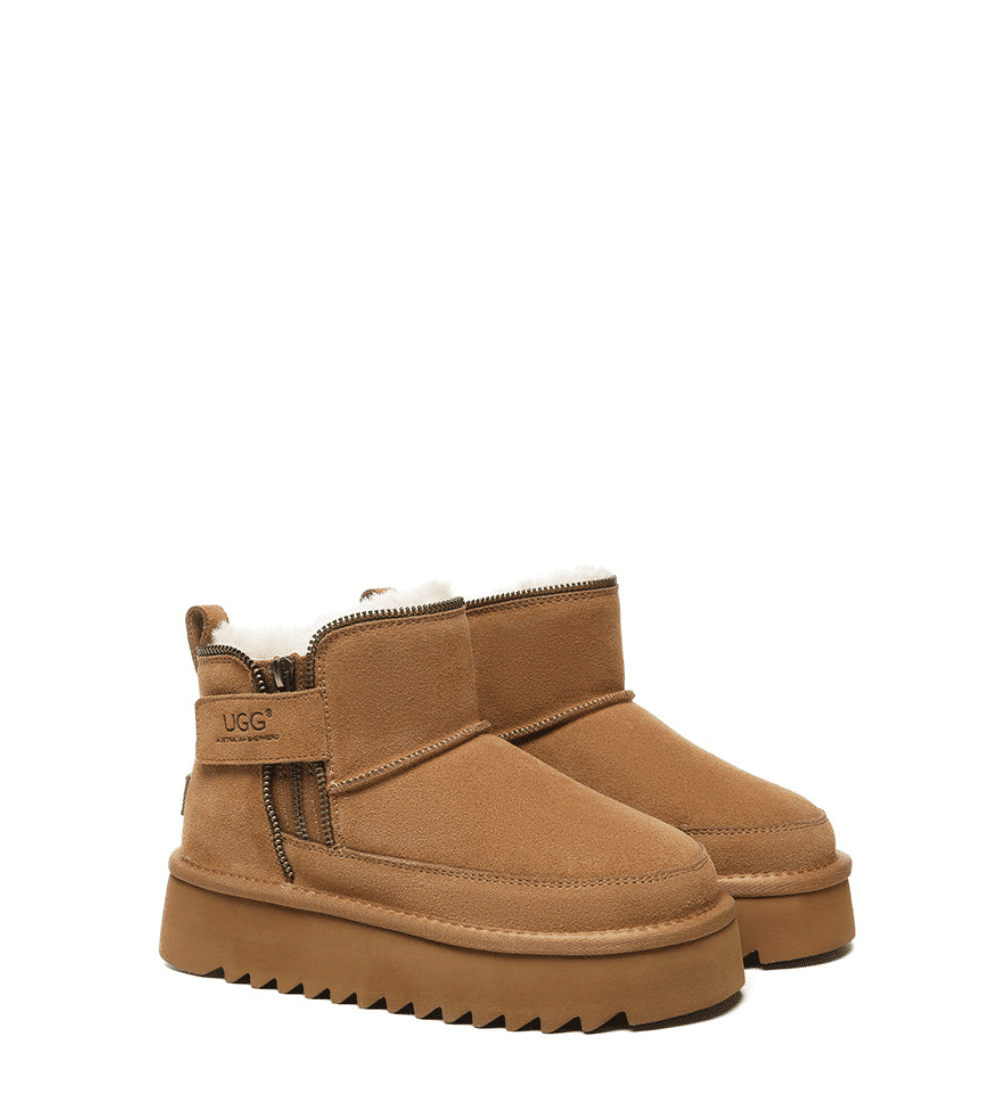 Elevate your winter style with the Australian Shepherd Arya Zipper Platform Boots, blending premium sheepskin comfort with contemporary design. The convenient side zipper adds both functionality and modern flair, while the trendy platform sole provides lightweight elevation. Available in chestnut and nappa black, these water-resistant boots deliver warmth and traction for all your cold-weather adventures without sacrificing style.