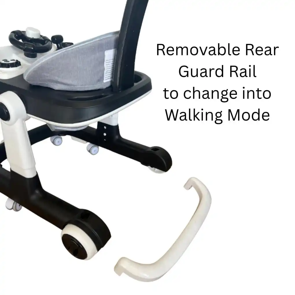 Converts easily from a seated walker to push-along mode with the removable rear guard rail.
