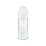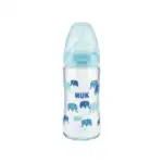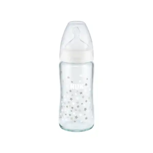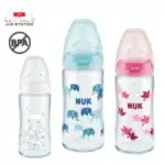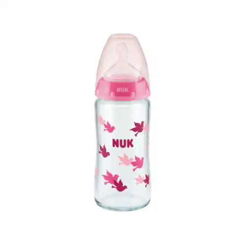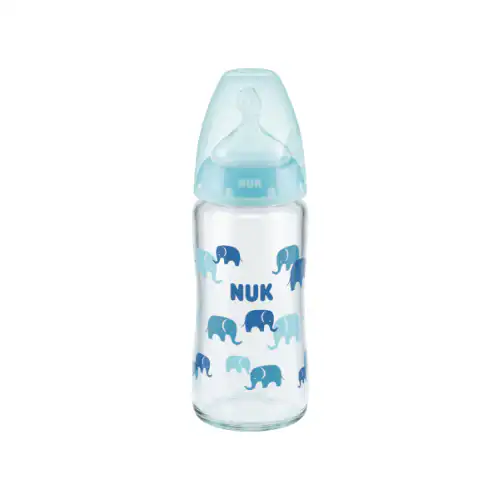 NUK First Choice+ Glass Baby Bottles with Temperature Control show at a glance when the right drinking temperature is reached. With Temperature Control, the scale on the bottle changes colour depending on the temperature of the contents. If the food is too hot, the normally blue indicator turns white.