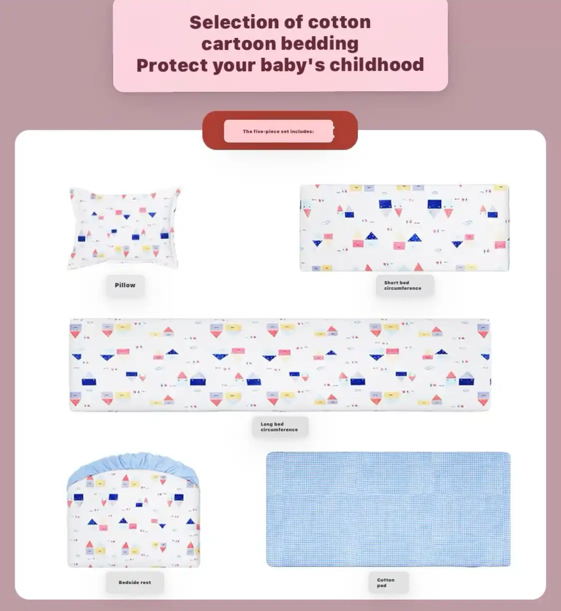 – Five-Piece Design Bedding Set: Includes cotton pad mat, pillow and 4 sides cushion protector with charming, child-friendly designs.