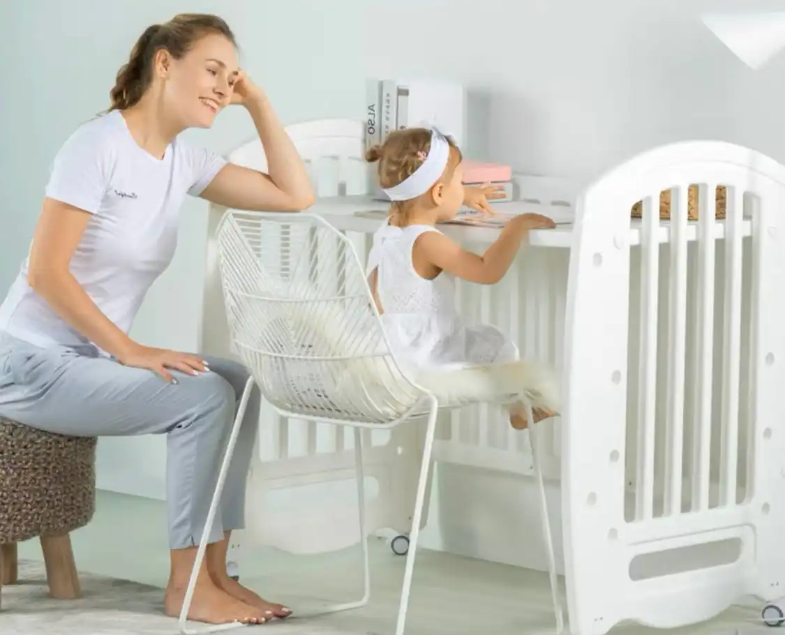 The Multifunctional ALL-IN-ONE Crib transforms from a safe sleeping and play space for infants into a functional desk for children up to three years old. Made from environmentally friendly PE materials, it features adjustable height options, 360° wheels for easy mobility, and a smooth-edged design ensuring safety throughout your child’s growth.