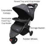 Includes a 3-wheel stroller, a parent cup holder, a child’s feeding tray, and an English manual. ‘The Jogger’ is the stroller for every parent who wants to maintain an active lifestyle without compromising their child’s comfort.