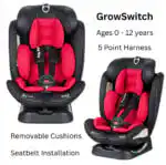 The GrowSwitch iSize Convertible Car Seat is the only car seat you’ll ever need, adapting from birth to approximately 12 years with rear and forward-facing options. Its 5-point harness system, adjustable recline and headrest, and removable cushions ensure safety and comfort as your child grows.
