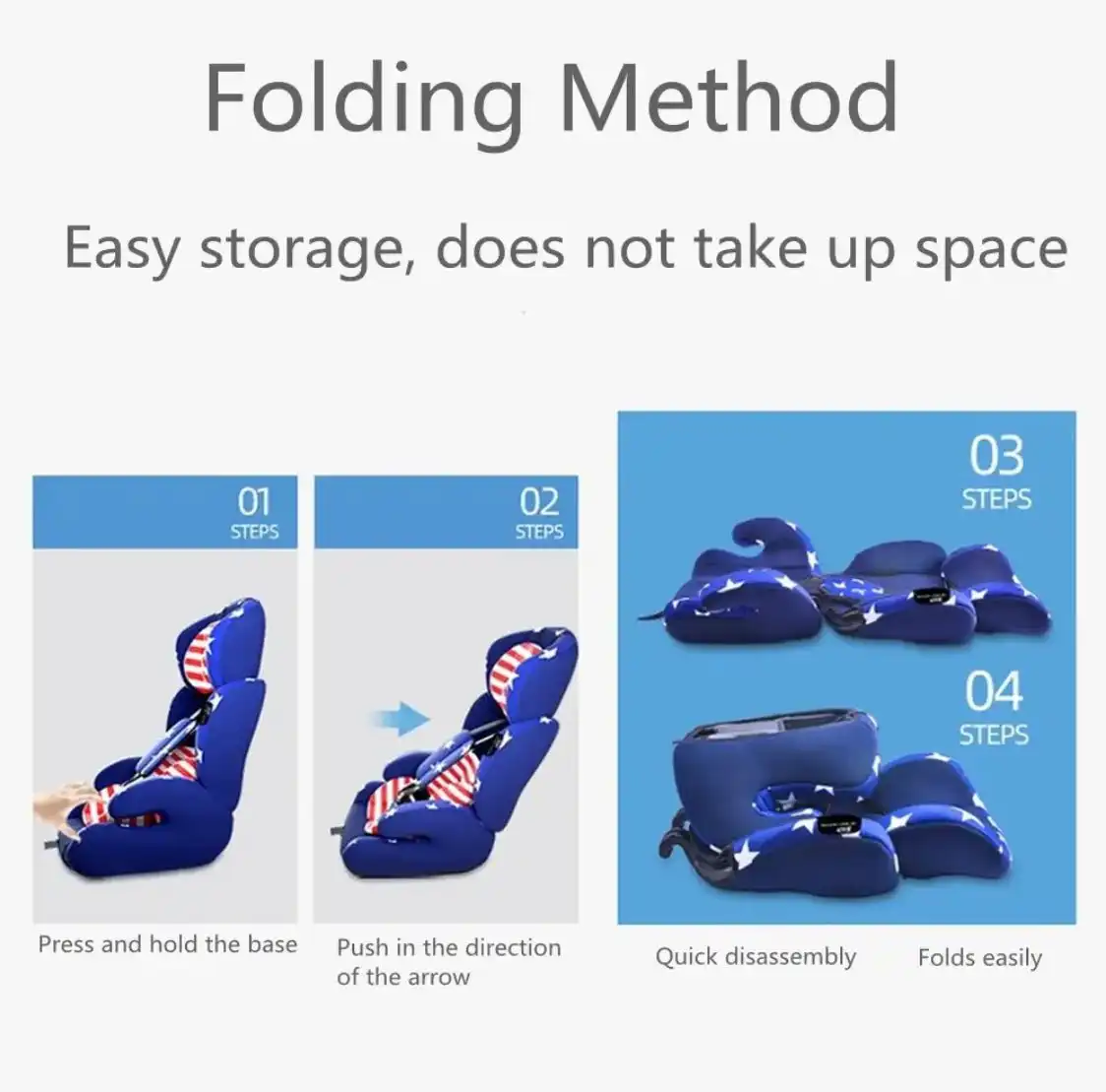 Travel with ease and ensure your child’s safety with our foldable booster seat. Designed for convenience and portability, the seat features an intuitive 4-step folding system that allows for quick assembly and disassembly. With robust side protection, adjustable headrest, and comfortable padding, it combines safety with comfort.
