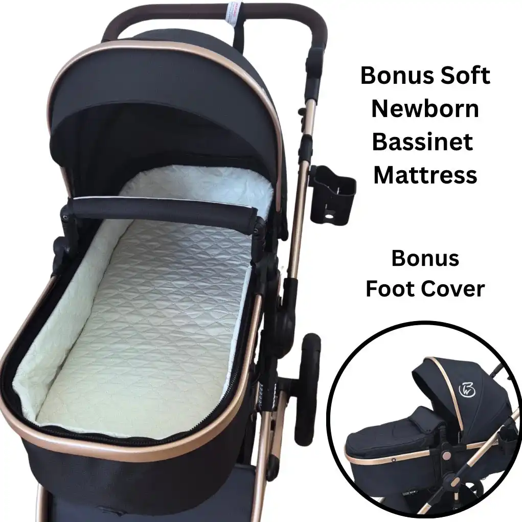 The Baby Way Supra Travel System is designed to grow with your child from birth to 3 years. With a luxe black and gold frame, plush folding bassinet, and safety-certified capsule and optional base, it’s the perfect all-in-one pram combo. This is our most innovative and ultimate combo packed with features, functionality, and colours to suit your lifestyle.