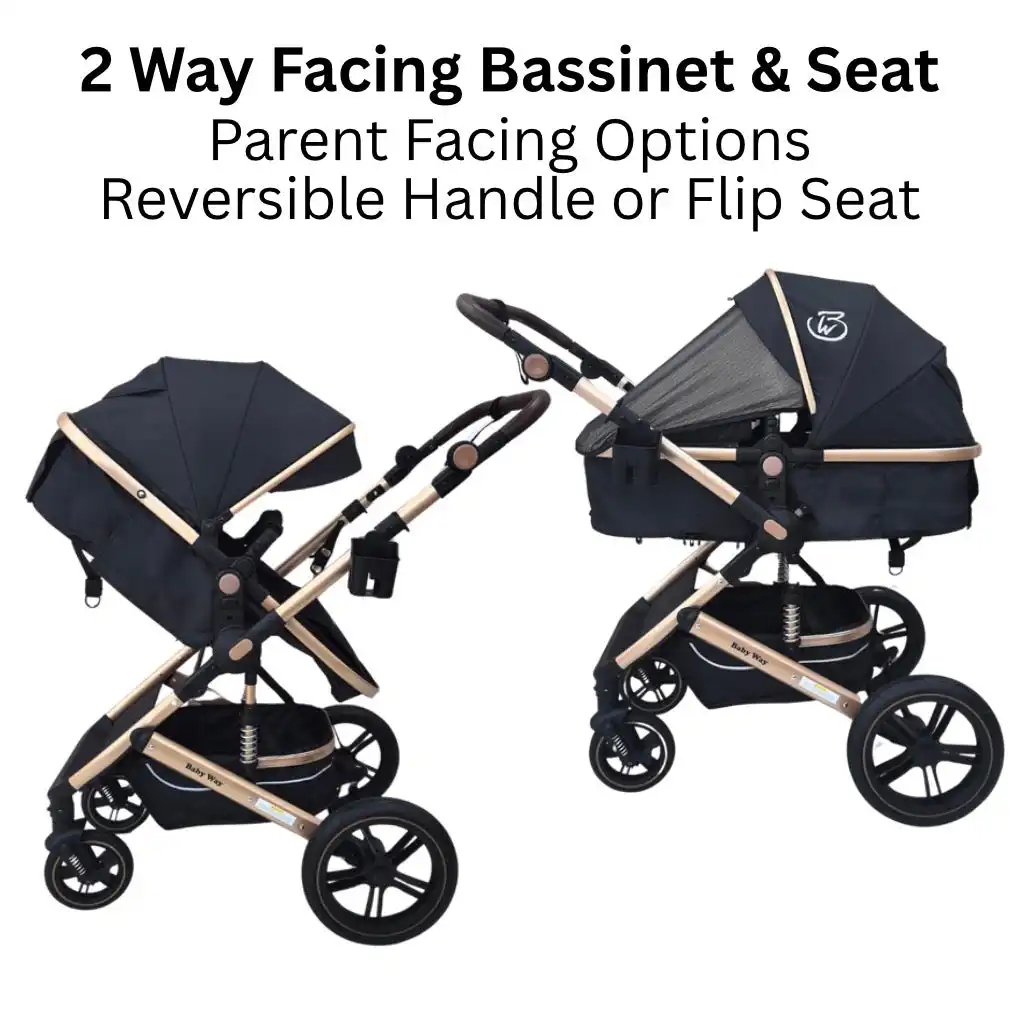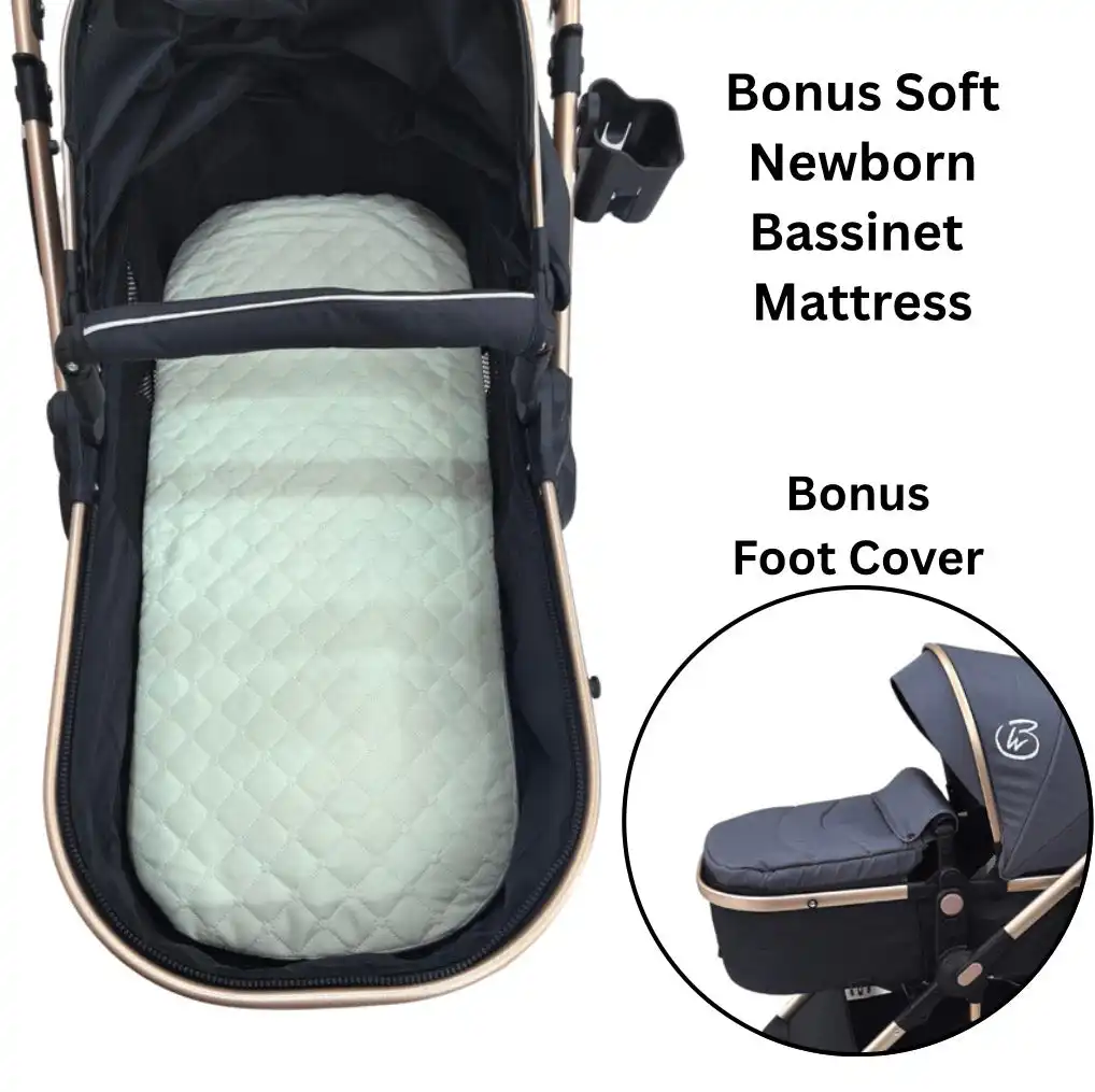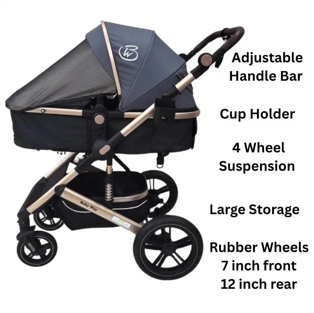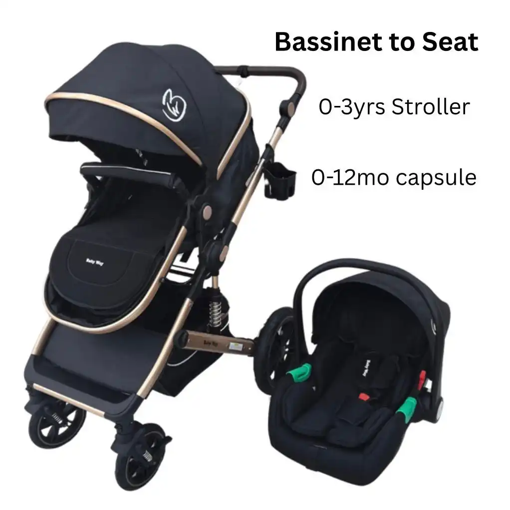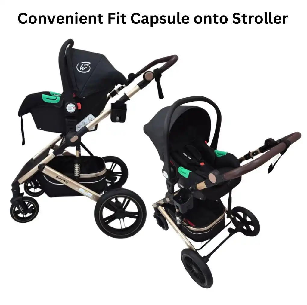 The Baby Way Supra Travel System is designed to grow with your child from birth to 3 years. With a luxe black and gold frame, plush folding bassinet, and safety-certified capsule and optional base, it’s the perfect all-in-one pram combo. This is our most innovative and ultimate combo packed with features, functionality, and colours to suit your lifestyle.