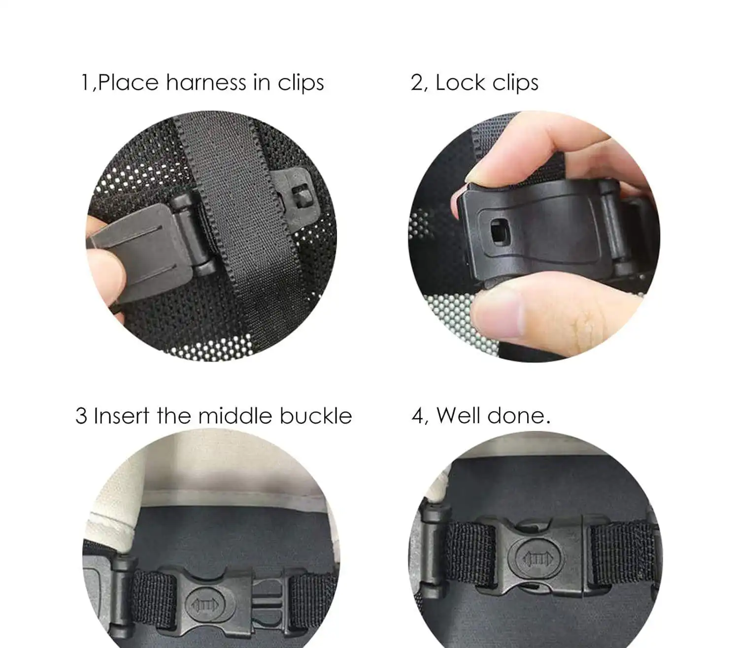1️⃣ Place the harness straps in the clips.