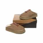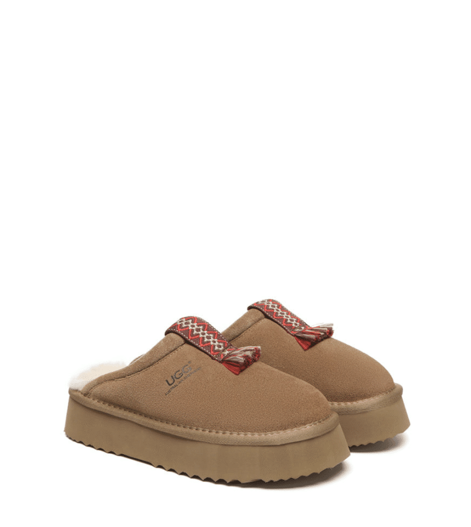 Step into elevated comfort with our Calla Tazzy Slippers, featuring a fashion-forward 4cm platform and luxurious sheepskin lining. The water-resistant cow suede exterior protects against spills while the plush wool interior keeps feet perfectly cozy. With their elegant ethnic-inspired detailing and timeless chestnut hue, these slippers effortlessly transition from lazy Sundays to casual outings.
