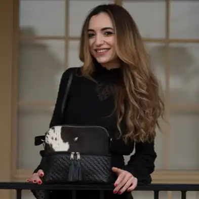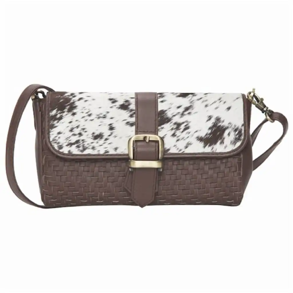 This sling bag is available in Black & White with brown leather and is designed to showcase your unique style. Keep in mind that cowhide patterns are entirely natural, making each bag one-of-a-kind.