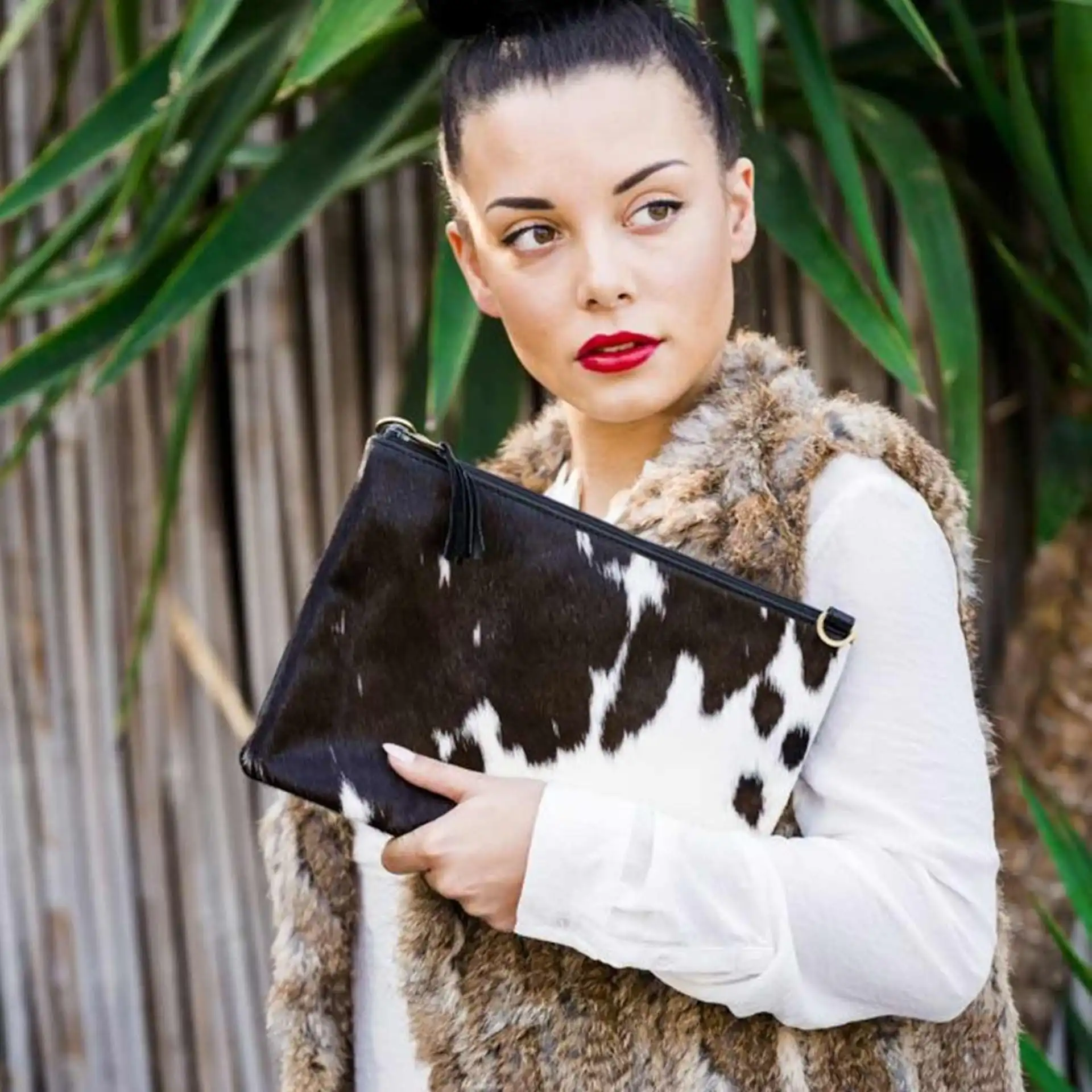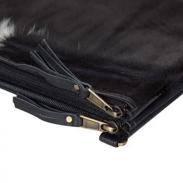 Choose your style from two elegant options: Black & White with black leather or Brindle with black leather. Please note that the cowhide patterns are entirely natural, making each bag a unique masterpiece.