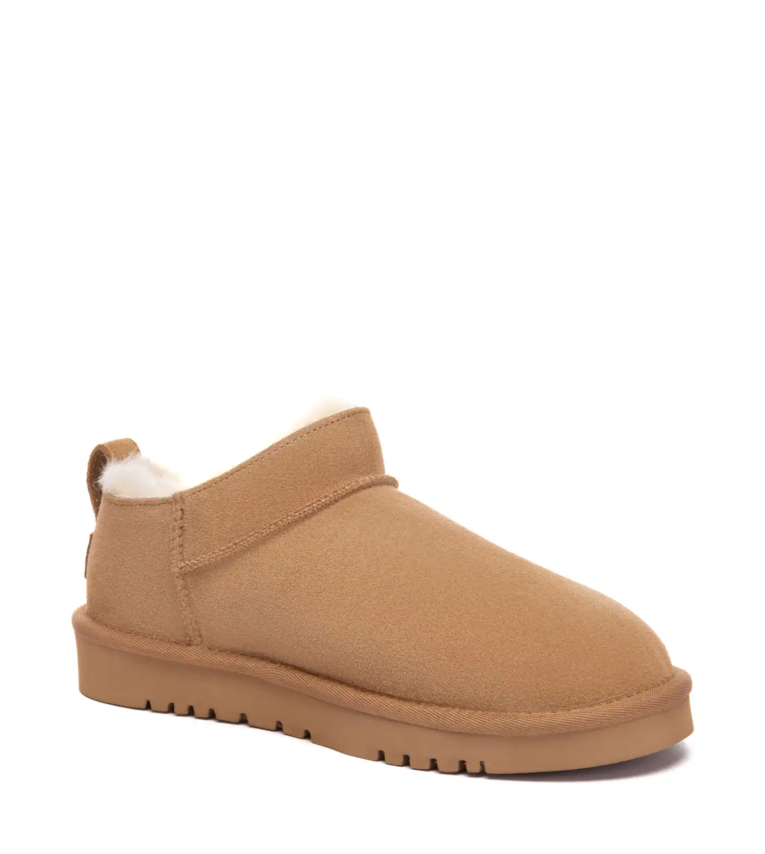 Experience ultimate comfort with the Lune, featuring a plush sheepskin wool lining and insole, designed for a luxurious feel. The durable cow suede upper and lightweight EVA rubber sole provide support and flexibility, making these shoes ideal for everyday wear. Available in chestnut and ecru, with sizes ranging from 35 to 40.