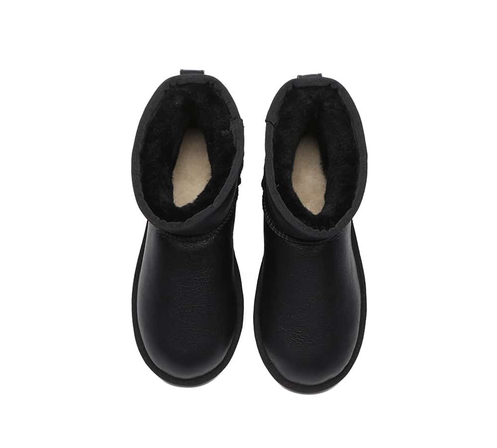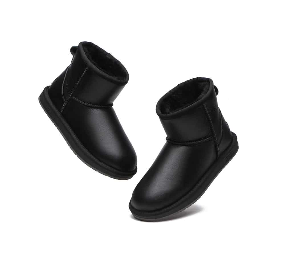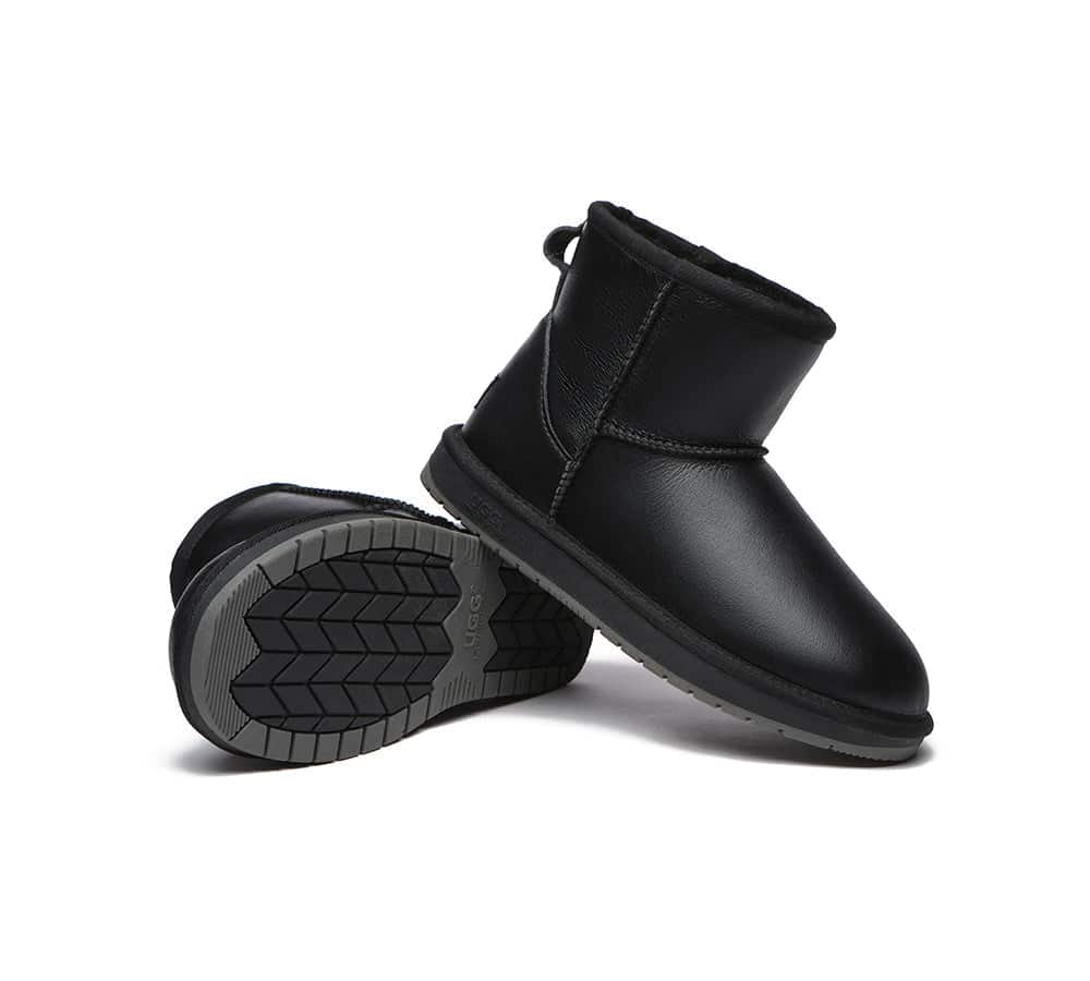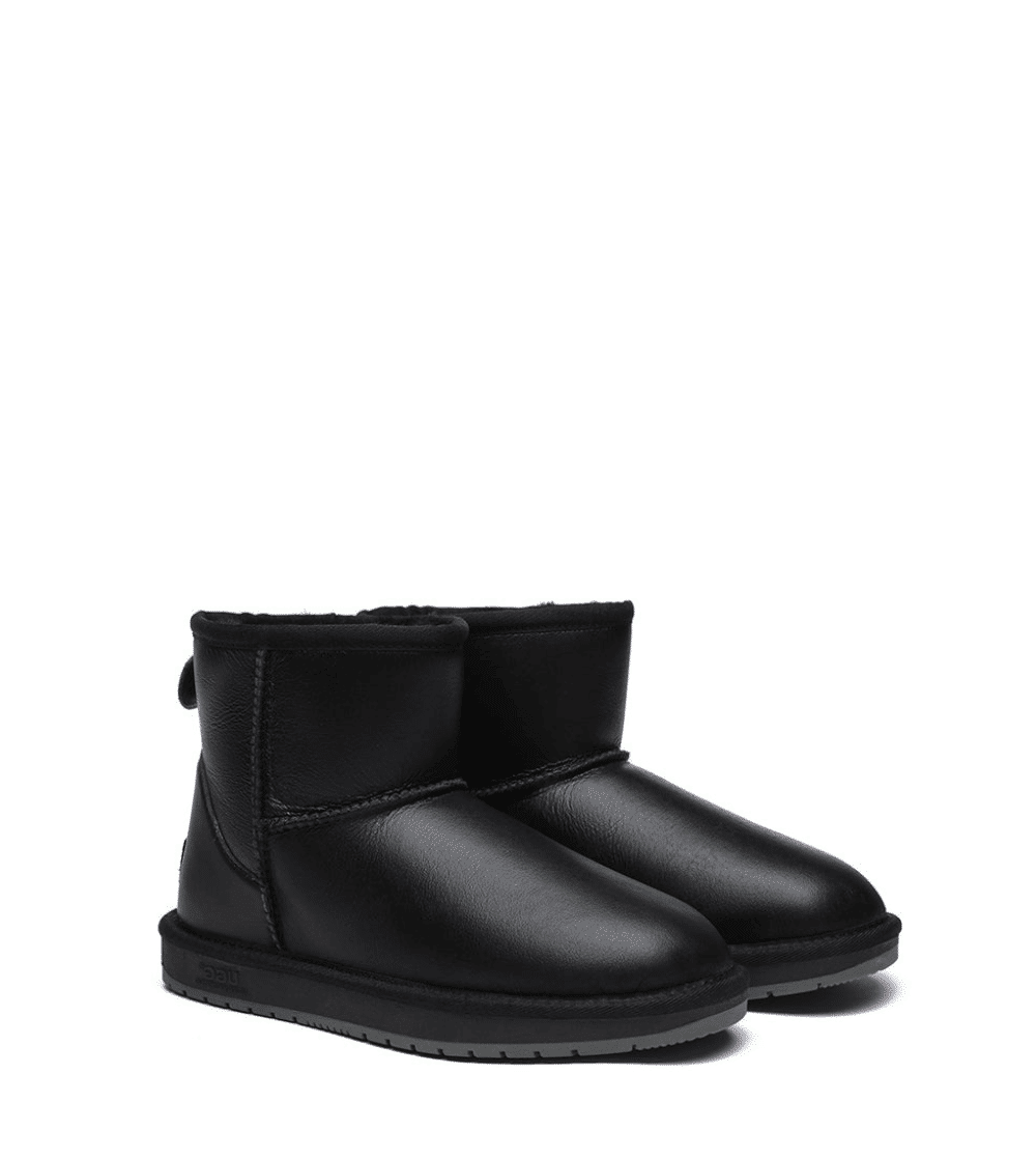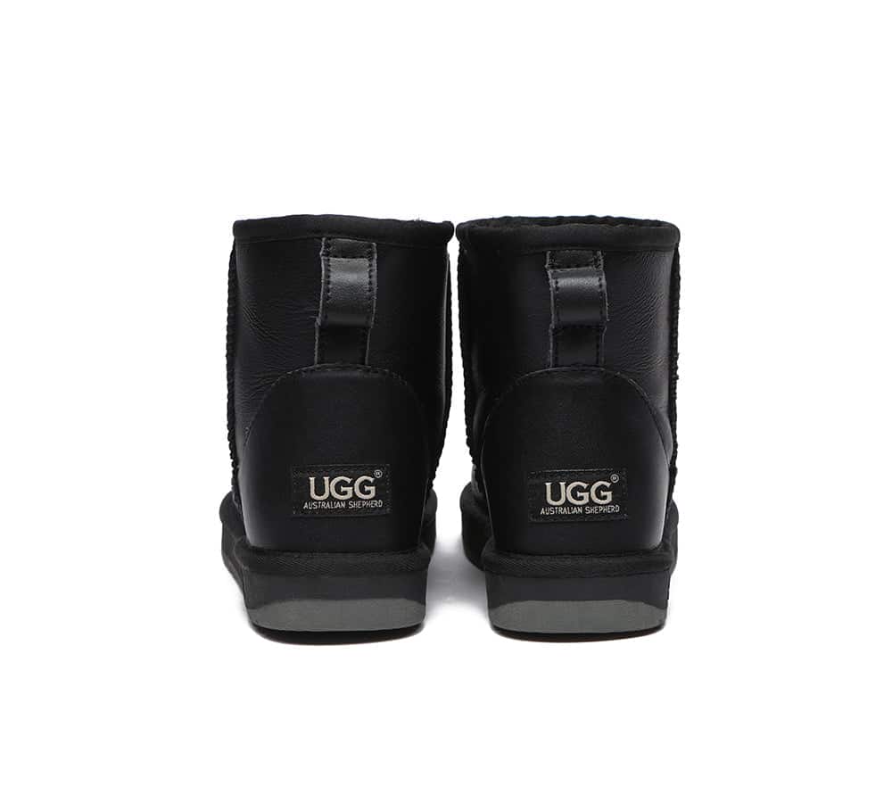 An icon of casual style, the Mini Classic UGG Boots – Nappa Black by Australian Shepherd blend everyday comfort with understated luxury. Crafted from premium double-faced sheepskin and finished with a water-resistant nappa leather exterior, these boots deliver breathable warmth in winter and cool comfort during warmer days. The low ankle design ensures easy slip-on access, while the plush wool insole and durable rubber outsole provide cushioned support and long-lasting wear. A timeless black finish makes this the ideal staple for every wardrobe.