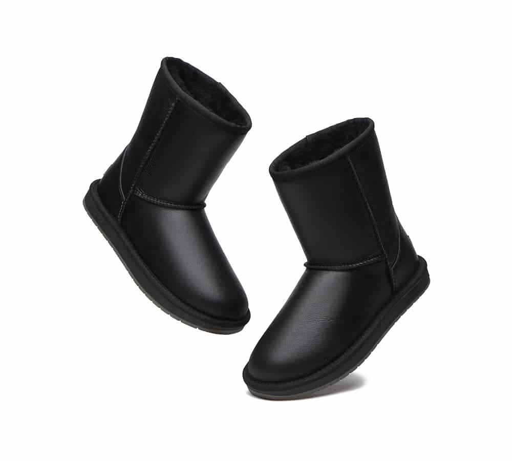Surround your feet in iconic comfort with the Short Classic UGG Boots – Nappa Black by Australian Shepherd. This timeless silhouette is crafted with luxurious double-faced sheepskin and finished with a sleek nappa leather upper for elevated style. The natural fibres of the plush wool lining offer warmth, breathability, and softness, while the TPR outsole provides dependable grip and flexibility for everyday wear. With its water-resistant finish and classic black hue, this boot is as practical as it is sophisticated—making it a winter essential you’ll reach for again and again.