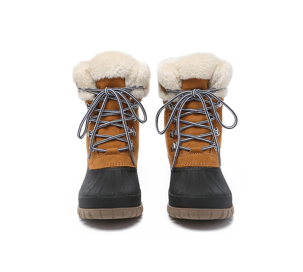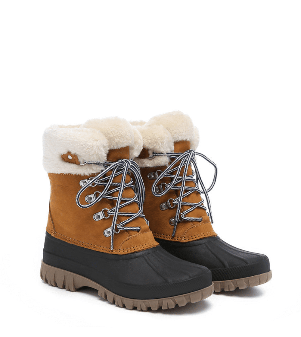 Stay warm, stylish, and protected on your next winter adventure with the Chunky Snow Boots Lace-up Natalia by Australian Shepherd. Designed to withstand extreme cold and snowy conditions, these boots feature a chunky, high-grip TPR sole, a cow leather and polyester upper for superior water resistance, and a thick plush lining for breathable warmth. The adjustable lace-up front ensures a secure fit, while the reinforced construction delivers stability on icy terrain. Available in Chestnut and White, they bring both function and flair to your après-ski wardrobe.