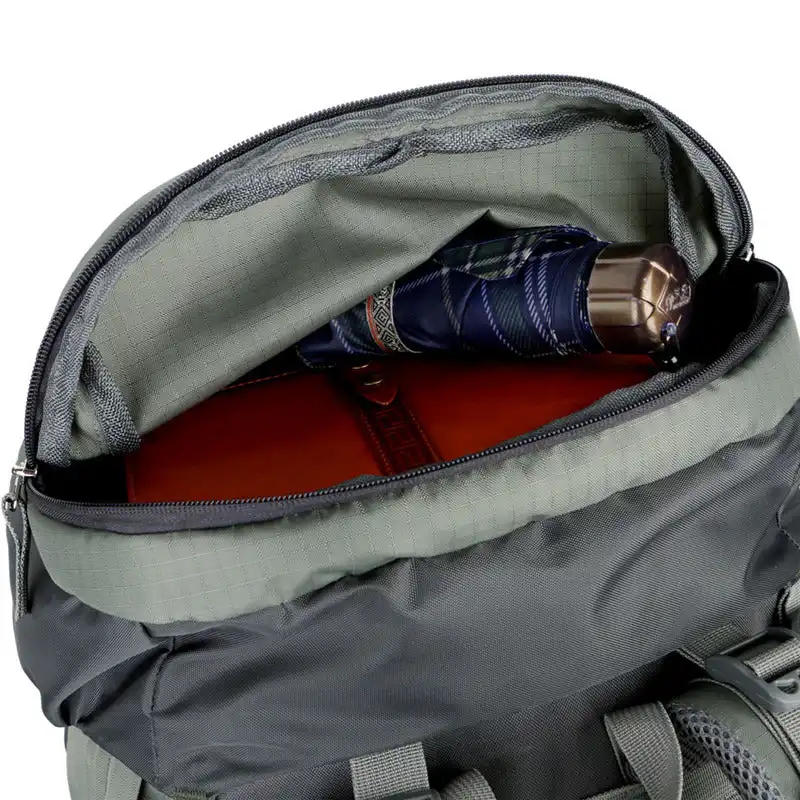 The top-loading design is complemented by side zip access for convenient packing and retrieval. The removable top lid includes an inner security pocket, while the backpack also features expanding side pockets, a front panel pocket with internal divider, a quick-access pocket for maps or headlamps, and a hydration reservoir sleeve.