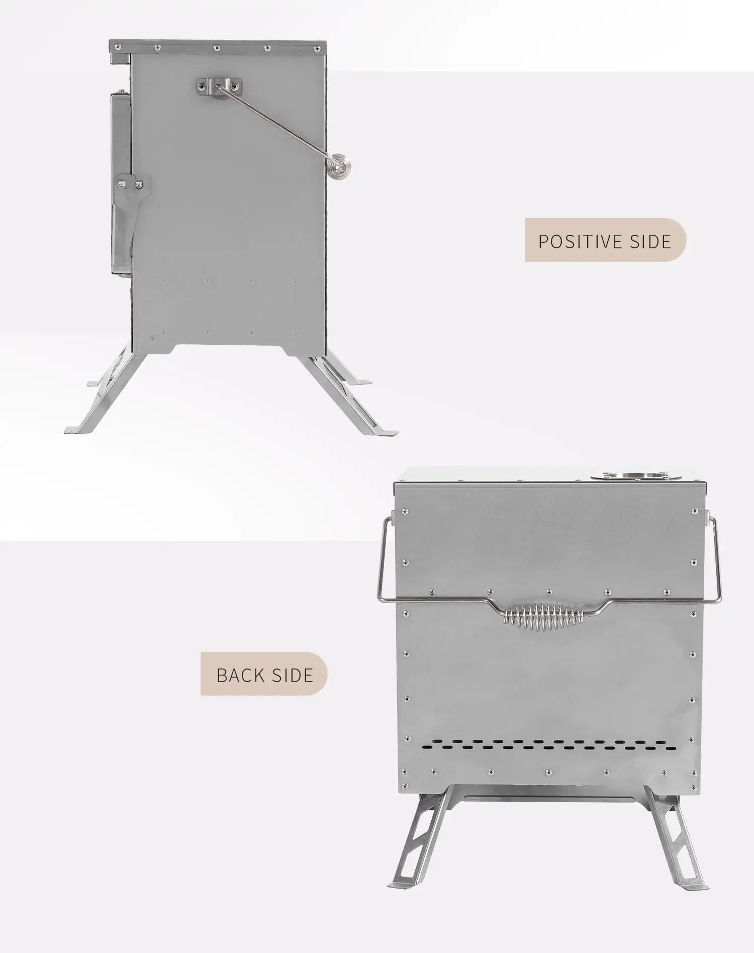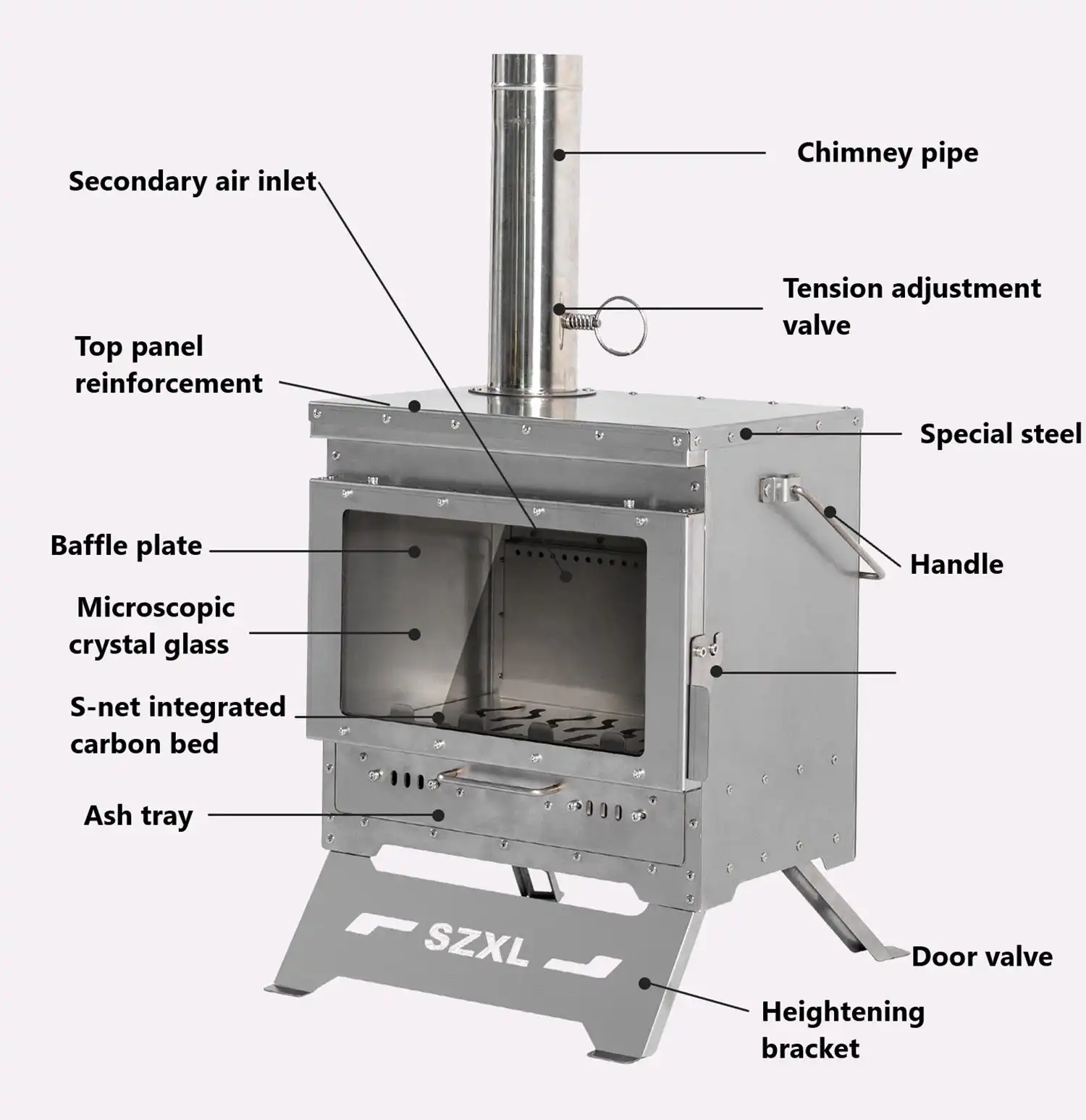 The stove features a bottom air intake system with left and right sliding controls, allowing precise airflow adjustment to ensure complete combustion of firewood. A drawer-style ash collection box makes cleaning easy and keeps your campsite tidy.