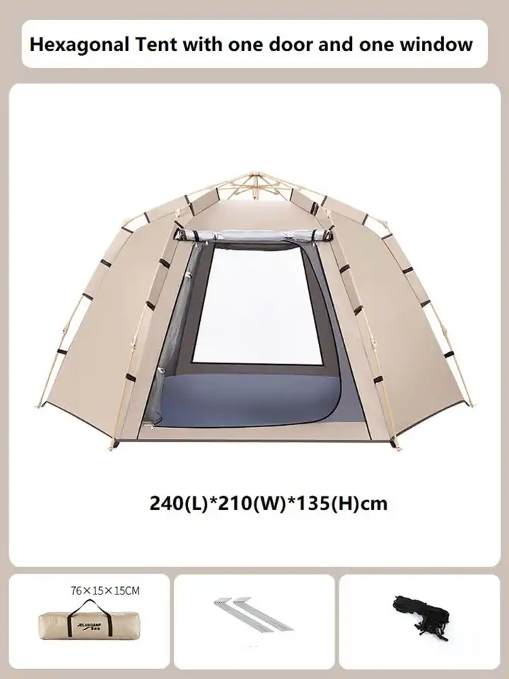 This hexagonal camping tent offers durability, convenience, and protection for overnight camping. Designed for 2–3 people, it features a foldable, portable design with a thickened fabric for extra comfort. The hexagonal shape, one door, and one window provide a spacious and well-ventilated environment.