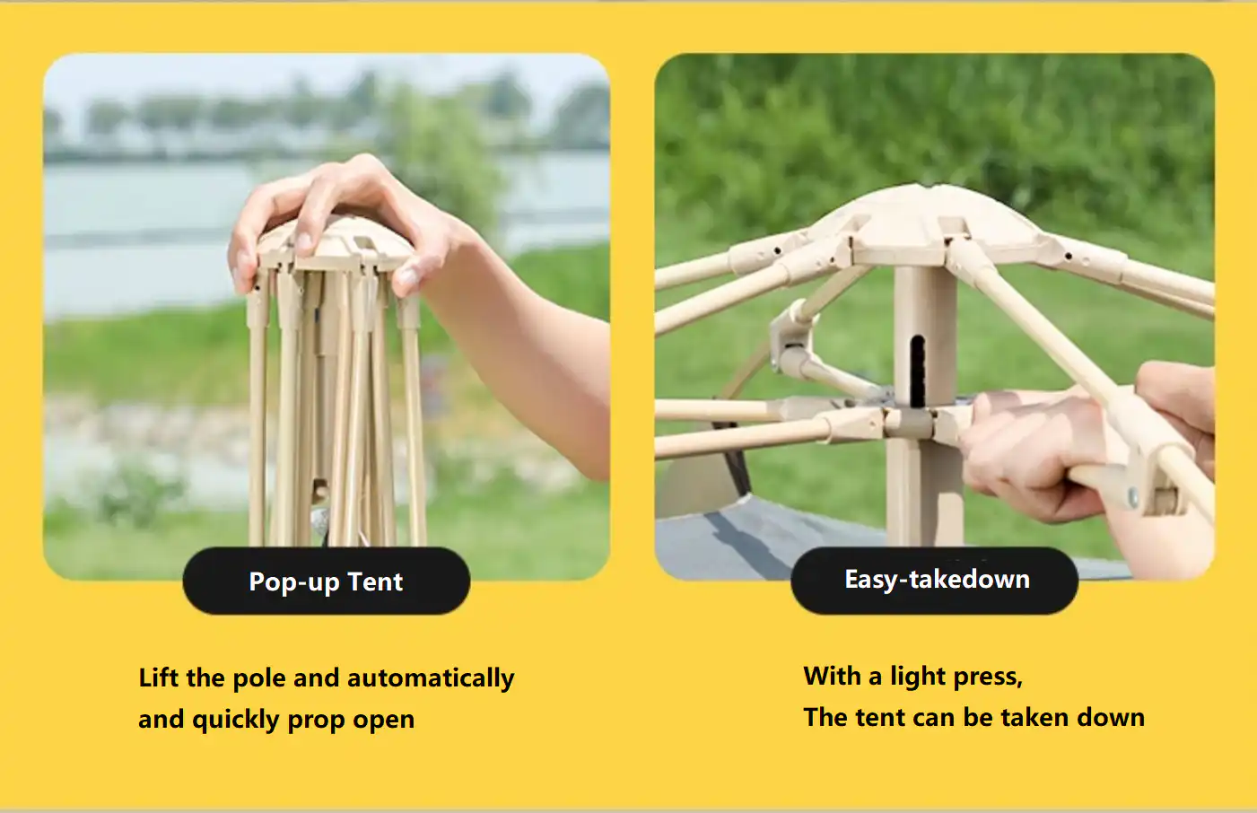 The tent features an automatic fast-pitch design, allowing for quick and easy setup by simply lifting the pole. Packing down is equally effortless with a gentle press, saving time and effort at camp.