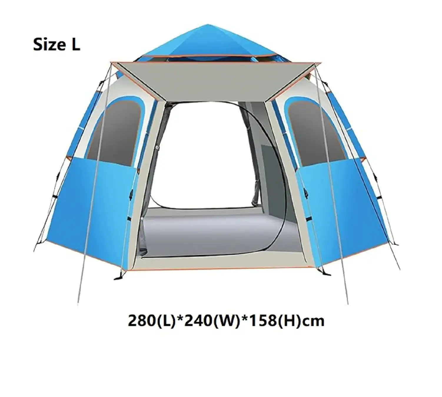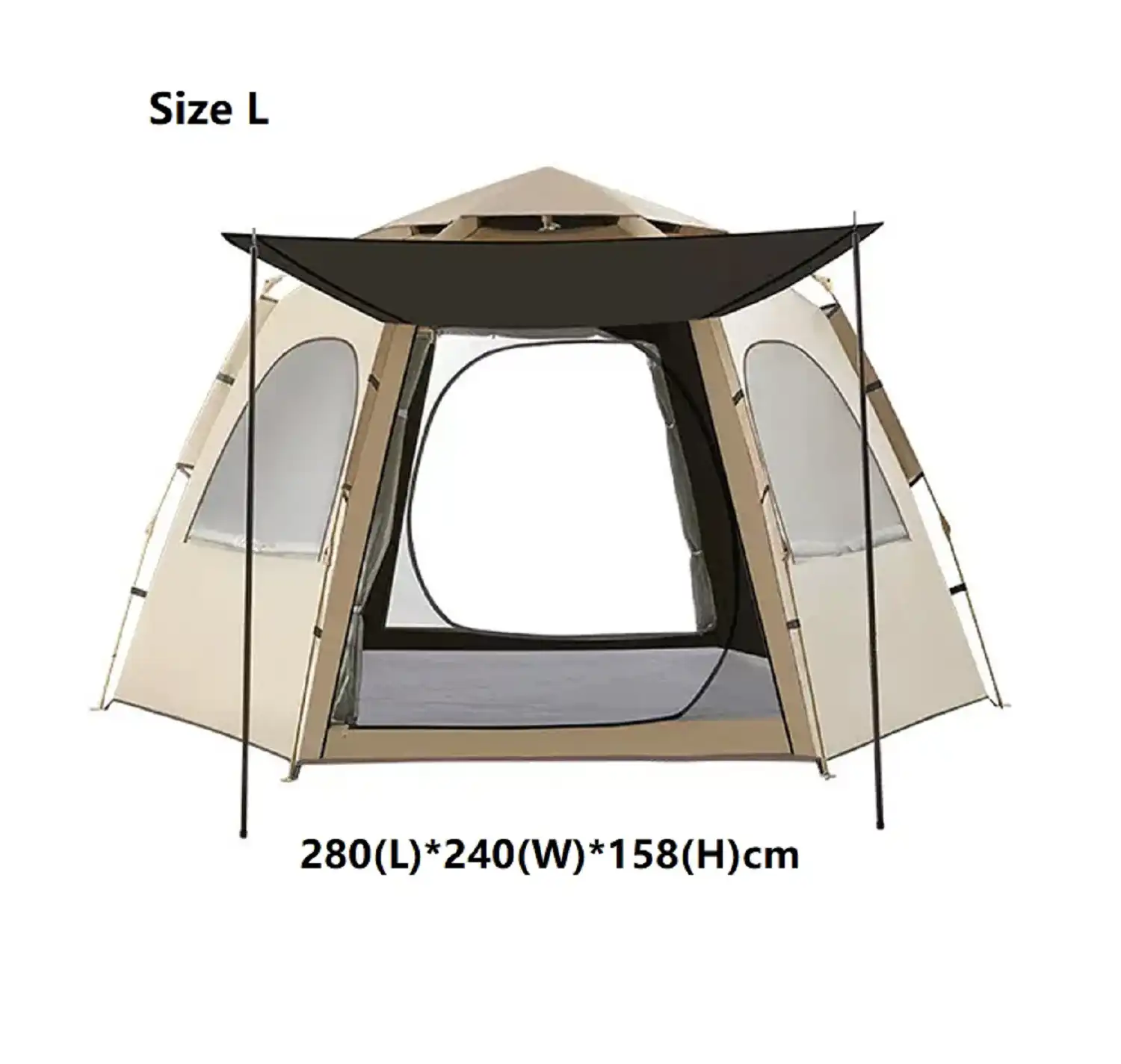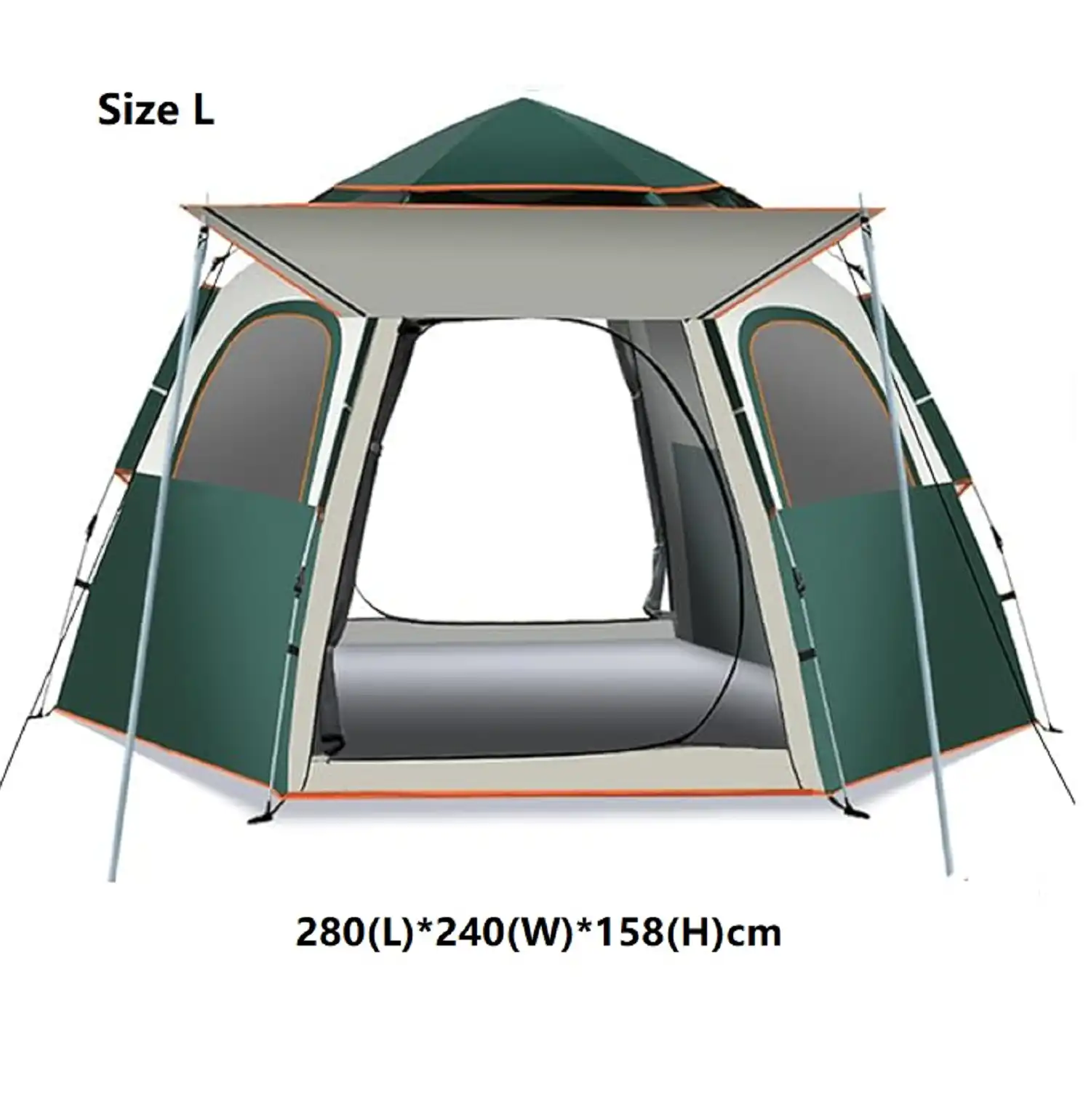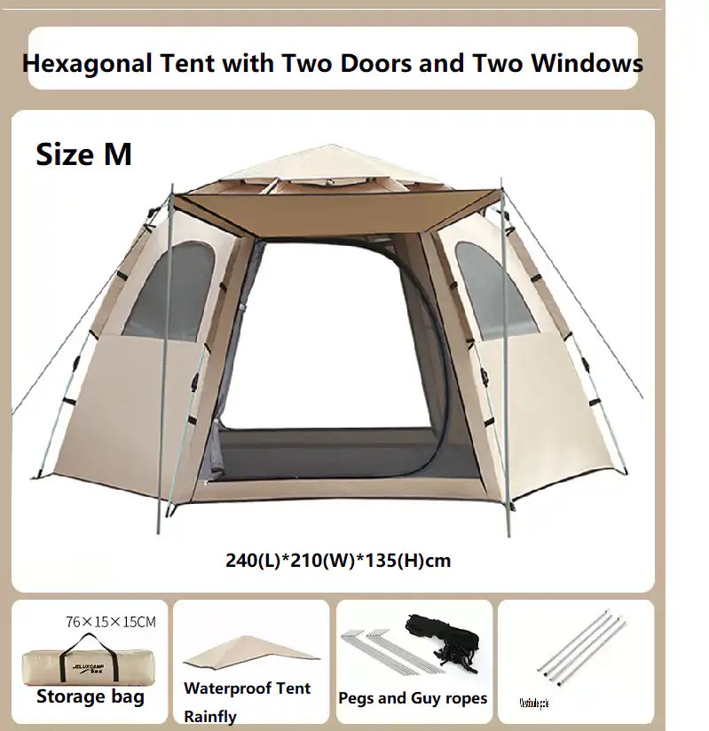 The unique hexagonal design, combined with two doors and two windows, creates a spacious and well-ventilated interior, making it comfortable for extended outdoor use.