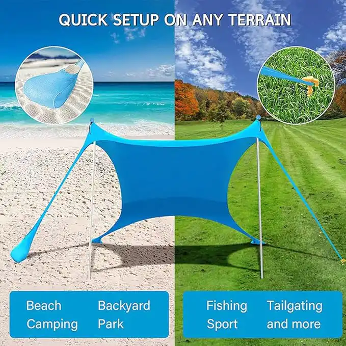 No complicated tools needed. Simply use sand, rocks, or other natural weights as anchors. The adjustable support pole allows you to change the canopy angle for the best sun coverage throughout the day.