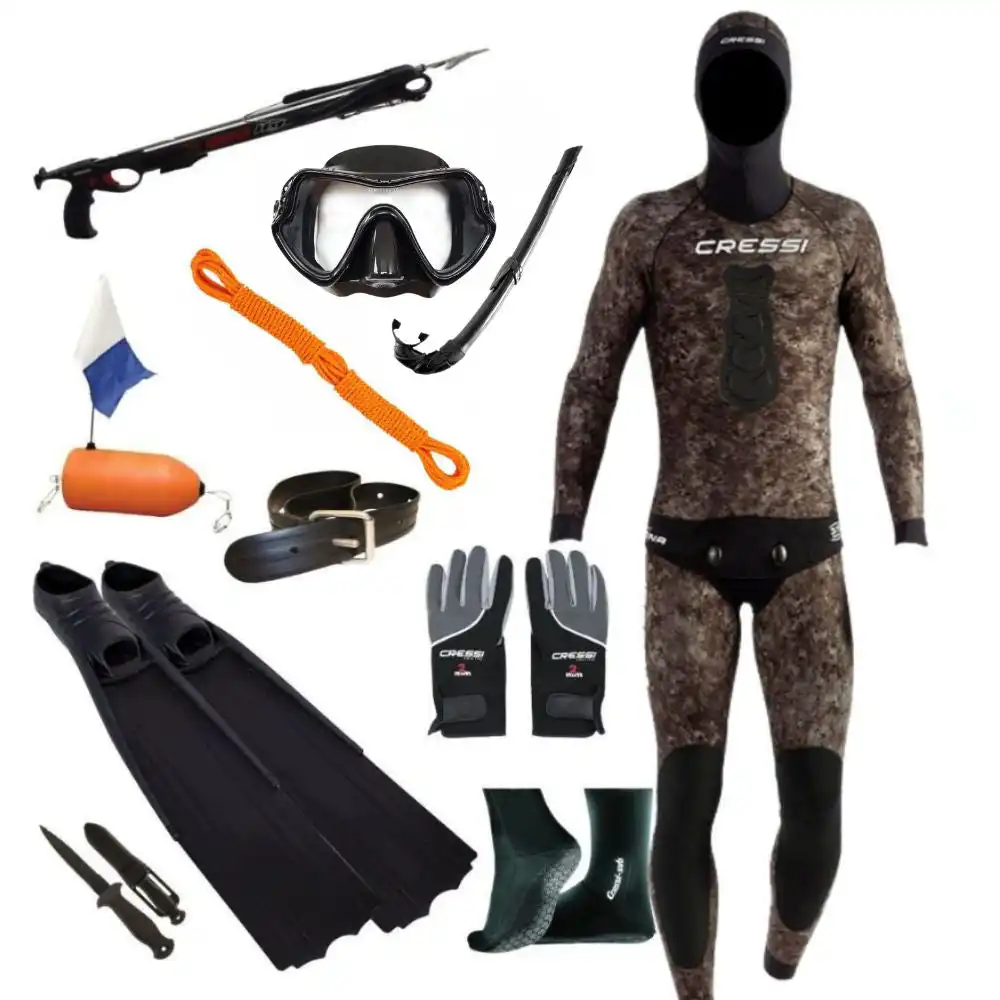 The Cressi Tracina and Immersed Spearfishing Package offers exceptional thermal insulation with a 5mm neoprene wetsuit, ergonomic fit for flexibility, and a camouflage pattern for stealth in underwater environments. Featuring a high-performance speargun, low-profile mask, efficient freediving fins, and sensitive dive gloves, this package is ideal for both novice and experienced spearfishers.