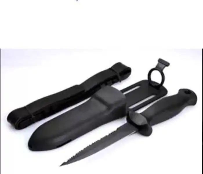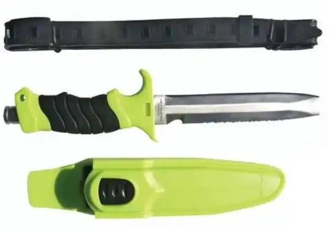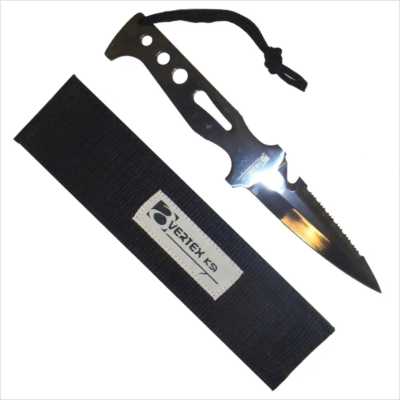 The Atlantis Vertex K51 Diving Knife is crafted from durable chemically darkened 420 stainless steel and comes with a webbing sheath for convenient wear on your leg, belt, or arm. Its design prevents snagging on lines or weeds, making it an essential tool for divers.
