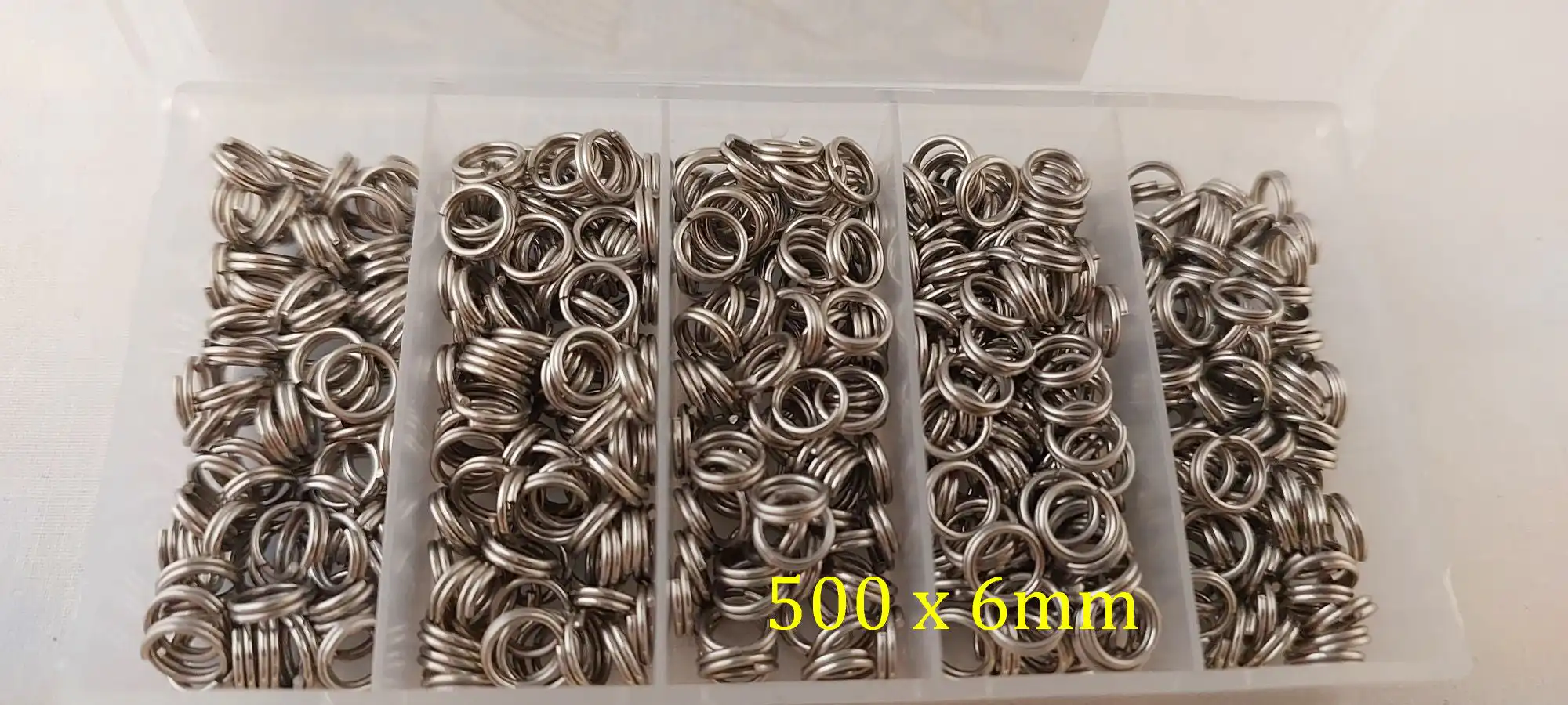This value pack includes 500 durable 6mm stainless steel split rings, perfect for various fishing applications. The handy storage container keeps your tackle organised and easy to access.