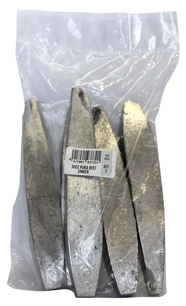 This Puka Reef Sinker Bulk Pack contains 5 sinkers in a sleek design, each weighing 30oz. They are specifically designed to be used for big game fishing, offering a durable and effective solution to your needs.