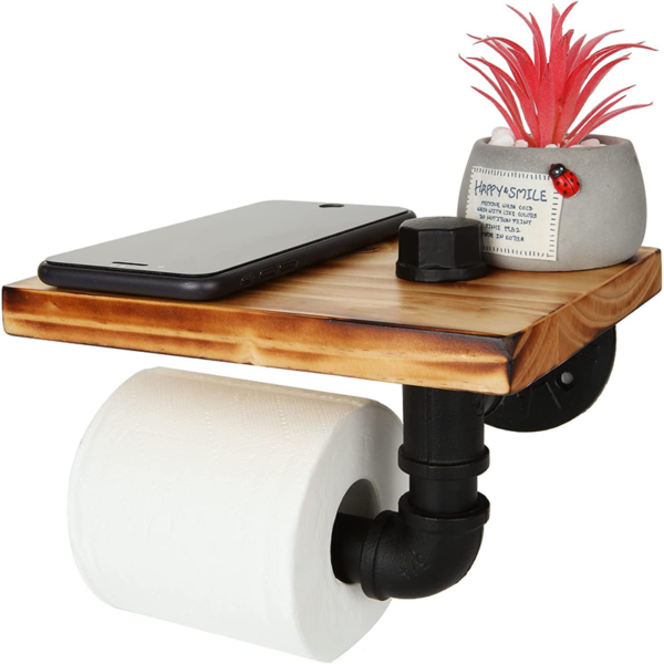 Industrial Toilet Paper Holder with Rustic Wooden Shelf