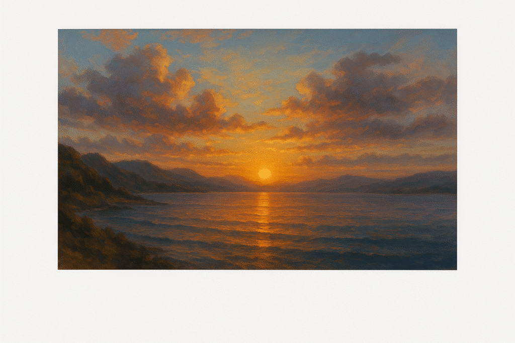 This premium art print captures the soft glow of evening light over tranquil waters, blending warm oranges and pinks with deep coastal blues.