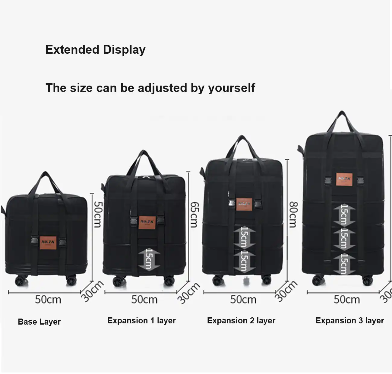 The bag features three bottom expansion zippers, allowing it to be adjusted into four different sizes. Easily expand or reduce the height to suit different packing needs and travel scenarios.