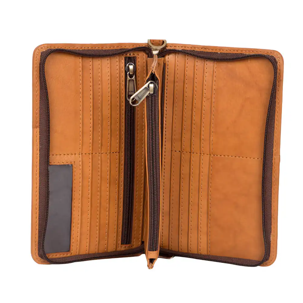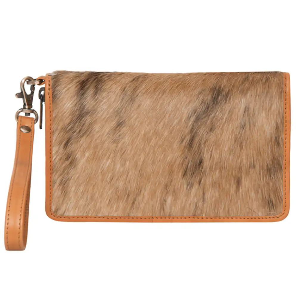One of our favorites, this beautifully oversized cowhide wallet is not only easy to carry but also boasts a sleek style and offers enough room for use as an evening cowhide clutch or for your travels. It serves as the perfect day-to-night option and comes with a detachable leather wrist strap for added convenience.
