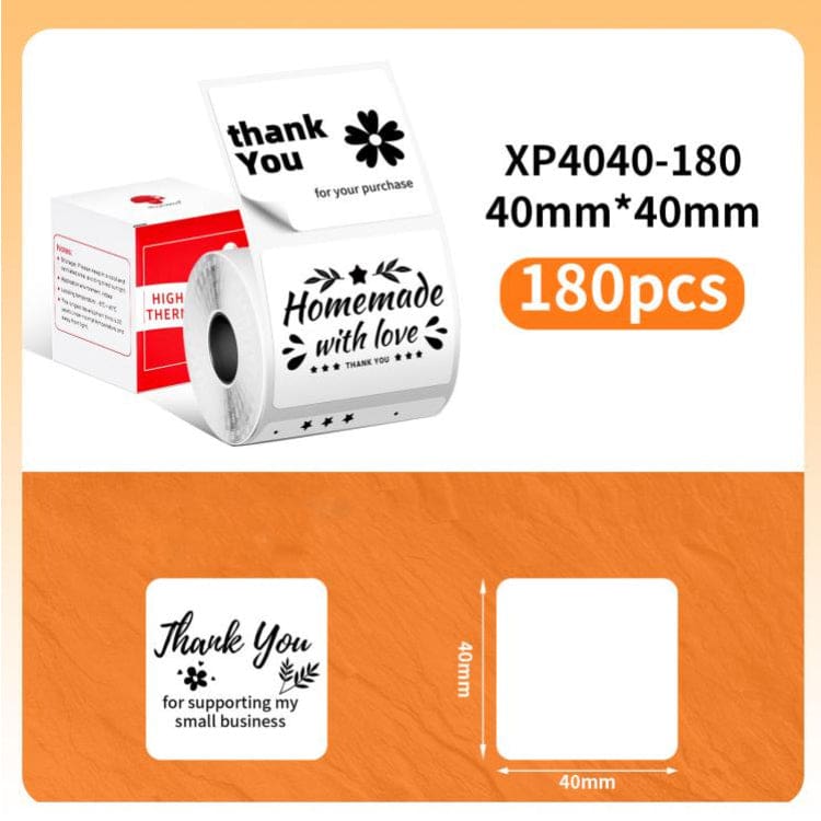 - 40x40mm Pre-Cut Labels, 180 labels (approx) per roll