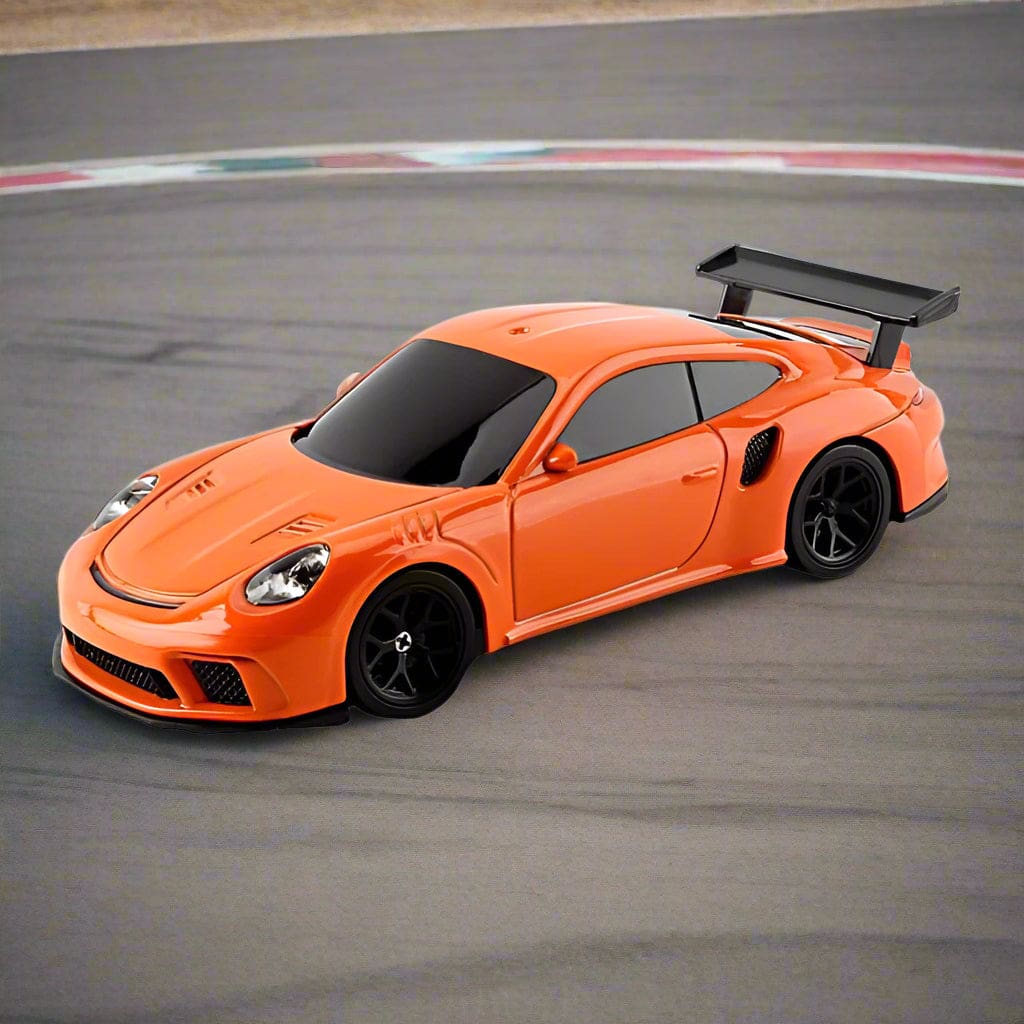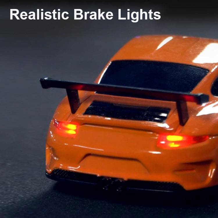 The package includes the 1/43 scale RC drift car, remote controller, Type-C charging cable, a spare set of tires for versatile drifting or racing, and traffic safety cones to set up your ultimate drift course.
