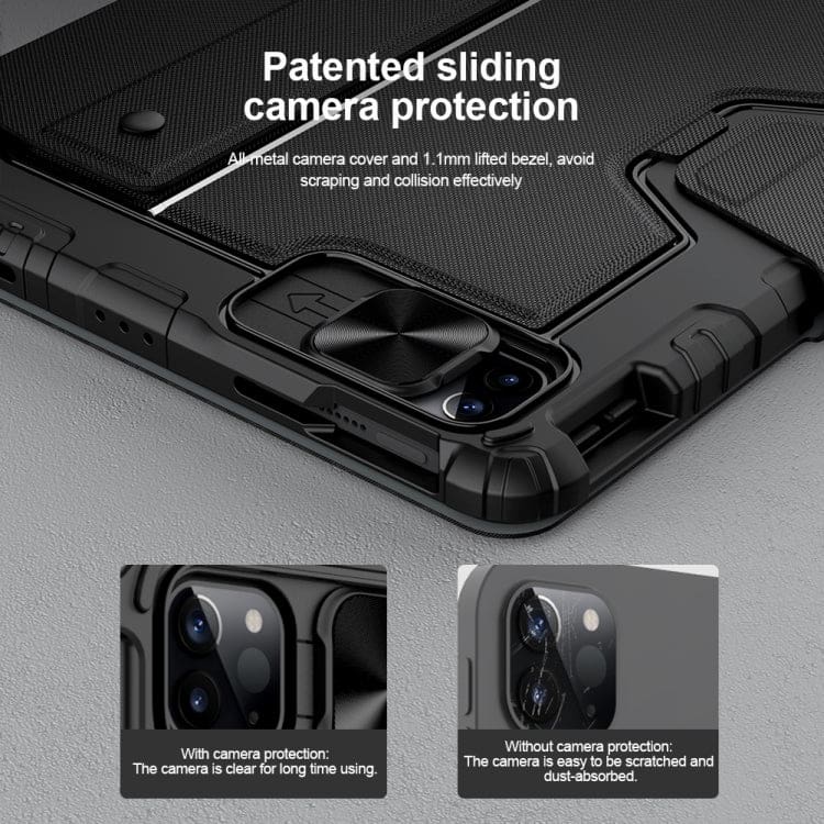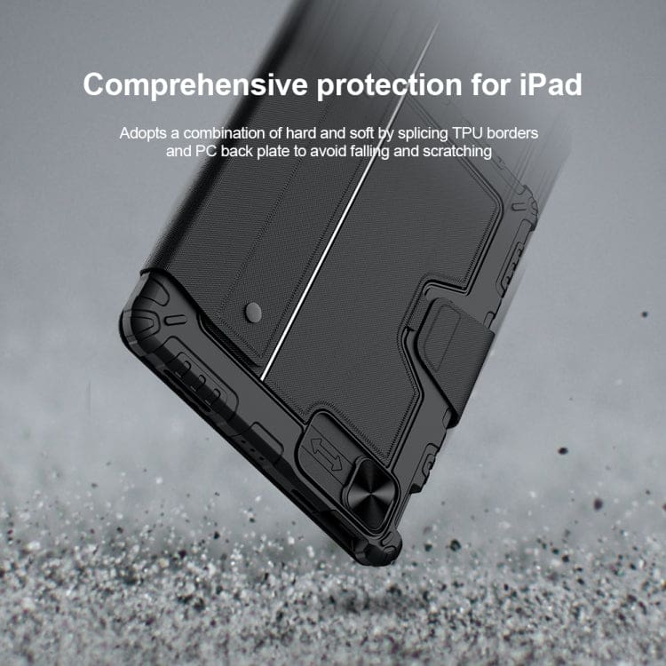 Enhance your productivity with the Nillkin premium cover featuring a detachable Bluetooth keyboard and touchpad, designed to protect your iPad Pro and Air series from scratches and knocks. Its adjustable angle stand allows for hands-free viewing, while the sliding camera lens protection and pen slot add further convenience.