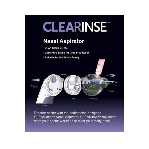 CLEARinse is a hospital-grade nasal cleansing system designed to help relieve nasal congestion and runny noses. Developed by a pediatric ENT (ear, nose, and throat doctor), this system combines a gentle nasal aspirator with a saline rinse to support natural breathing for people of all ages — including infants, children, and adults.