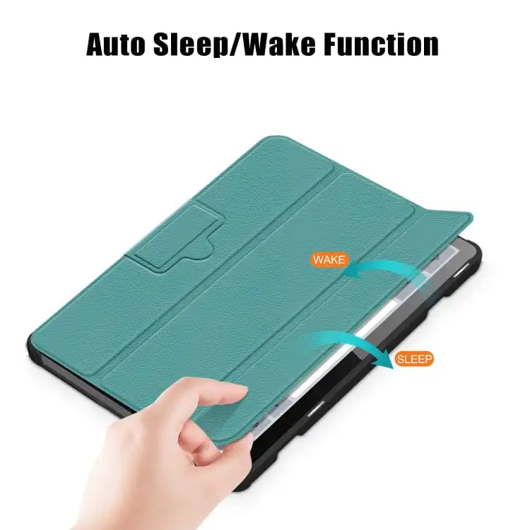 This cover is equipped with an auto wake/sleep function, which means the screen will automatically turn on when the cover is opened and turn off when it is closed. Additionally, it comes with a stylus holder space to keep your stylus within reach.