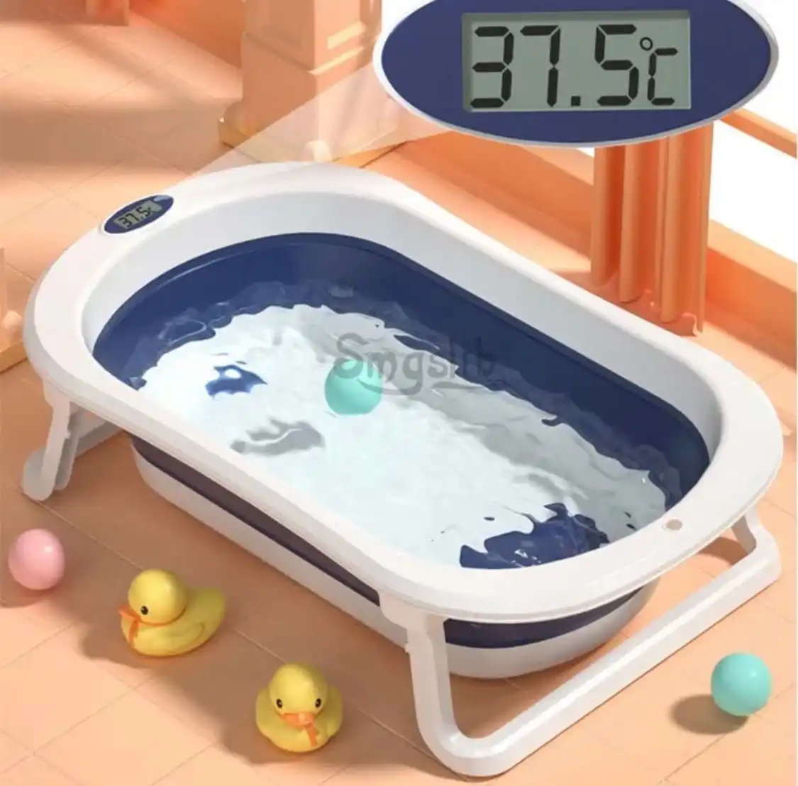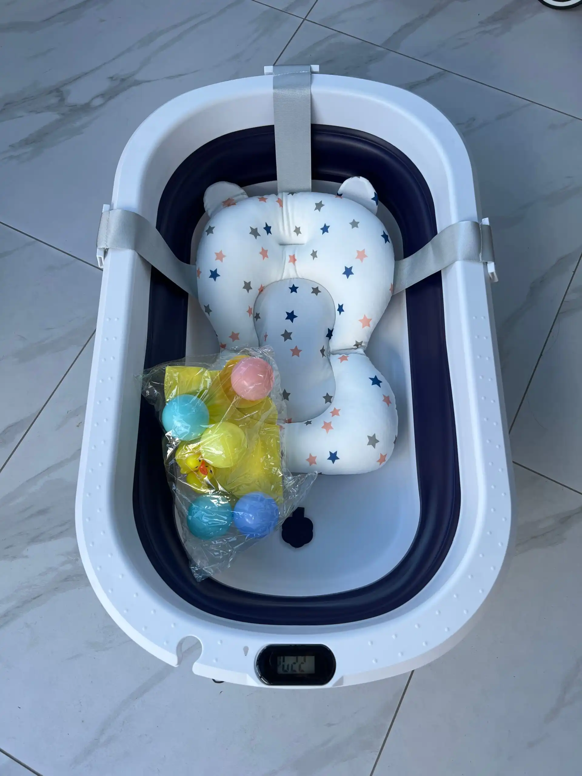Includes: Baby Bath Tub, support pillow, built-in temperature reader, 2 rubber ducks, 5 float balls, and baby shampoo cap.
