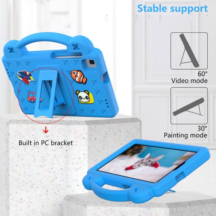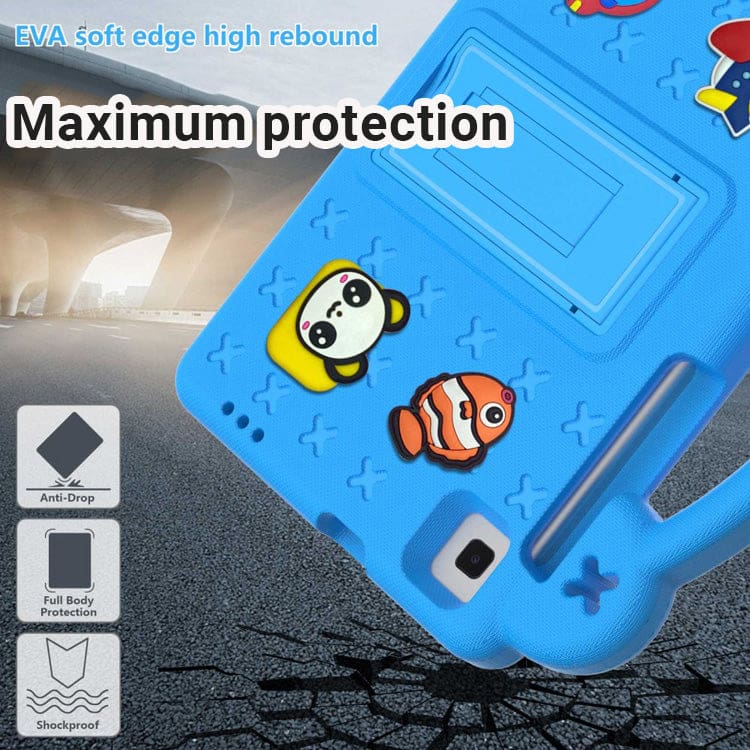 Protect your Samsung Galaxy Tab A7 Lite or Tab A with this thick EVA kids tablet cover. Designed with a built-in handle for easy portability and a stand for handy use, it offers maximum protection against drops and bumps while keeping your child entertained with removable cartoon characters.